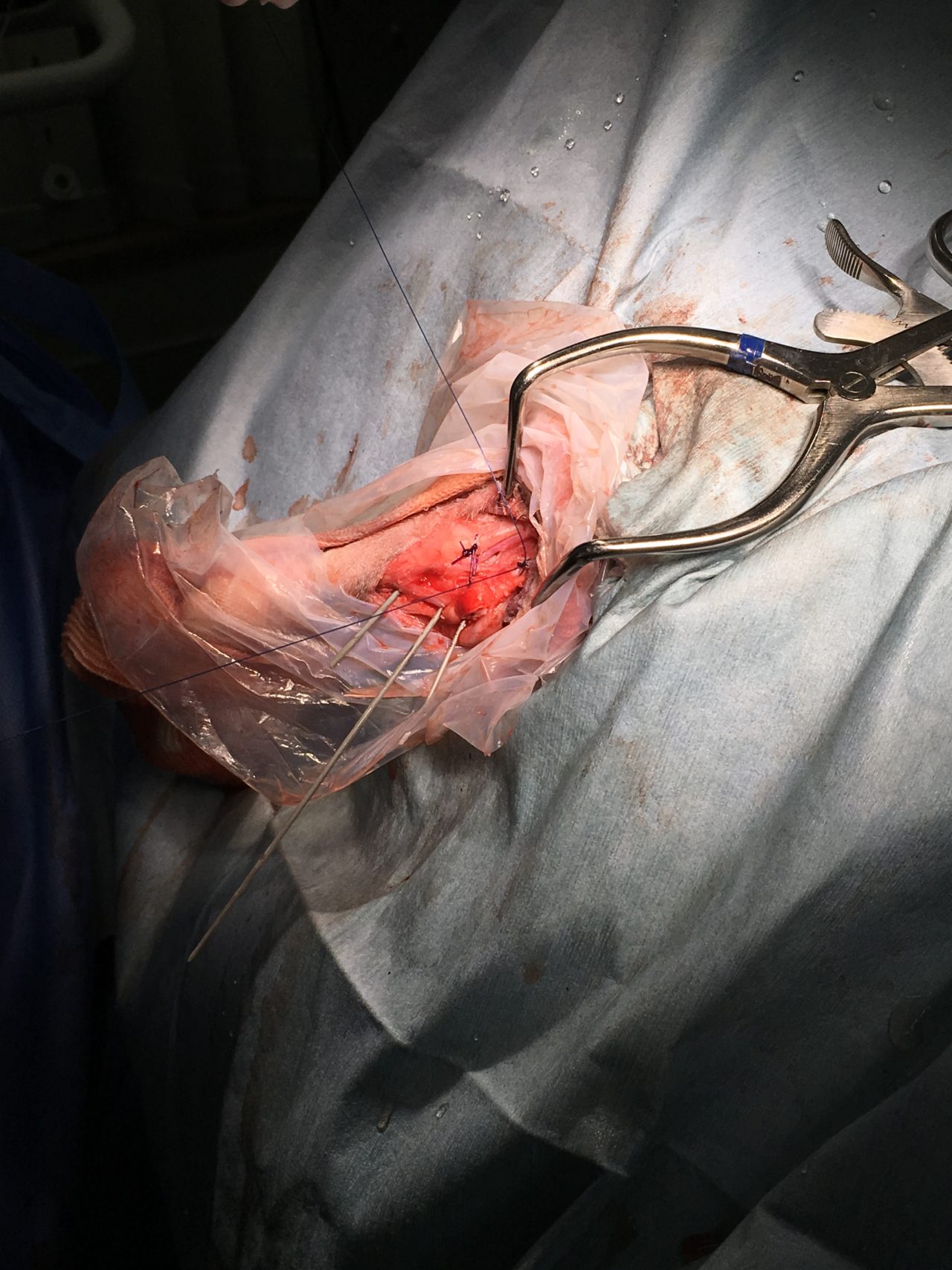 アキレス腱断裂 主治医よりアキレス腱断裂した患者さんが脚を着けなくなったので、なんとかして欲しいと連絡がありました。経関節ピンによる一時的な足根関節の仮固定とアキレス腱の縫合術により対応しました。しばらくは安静が必要です。 症例カテゴリー 放射線治療整形外科軟部組織外科脳神経外科内科腫瘍外科救急・集中治療リハビリテーション科腫瘍内科内視鏡科脳神経科呼吸器外科中医・漢方猫の腎移植循環器科