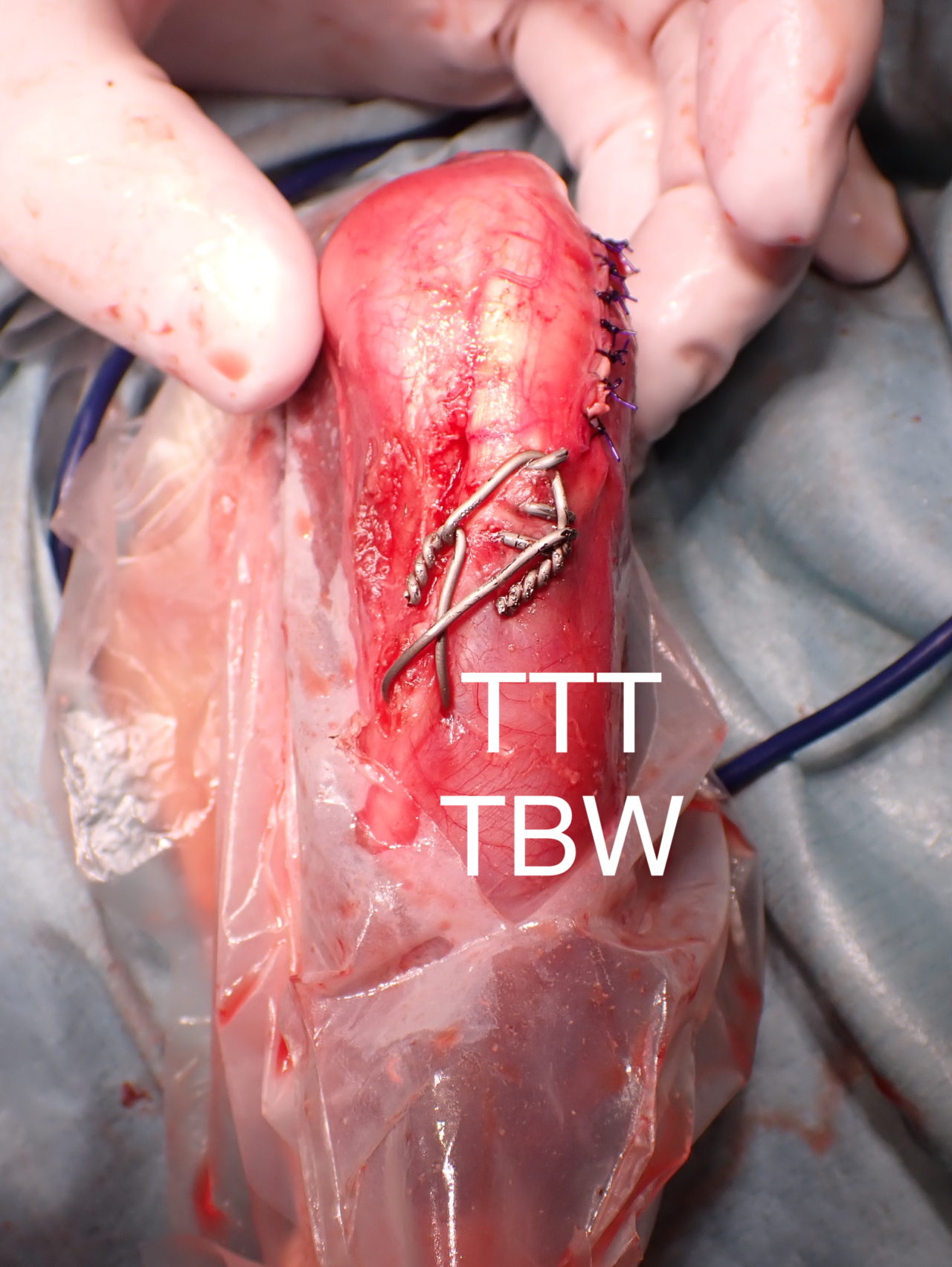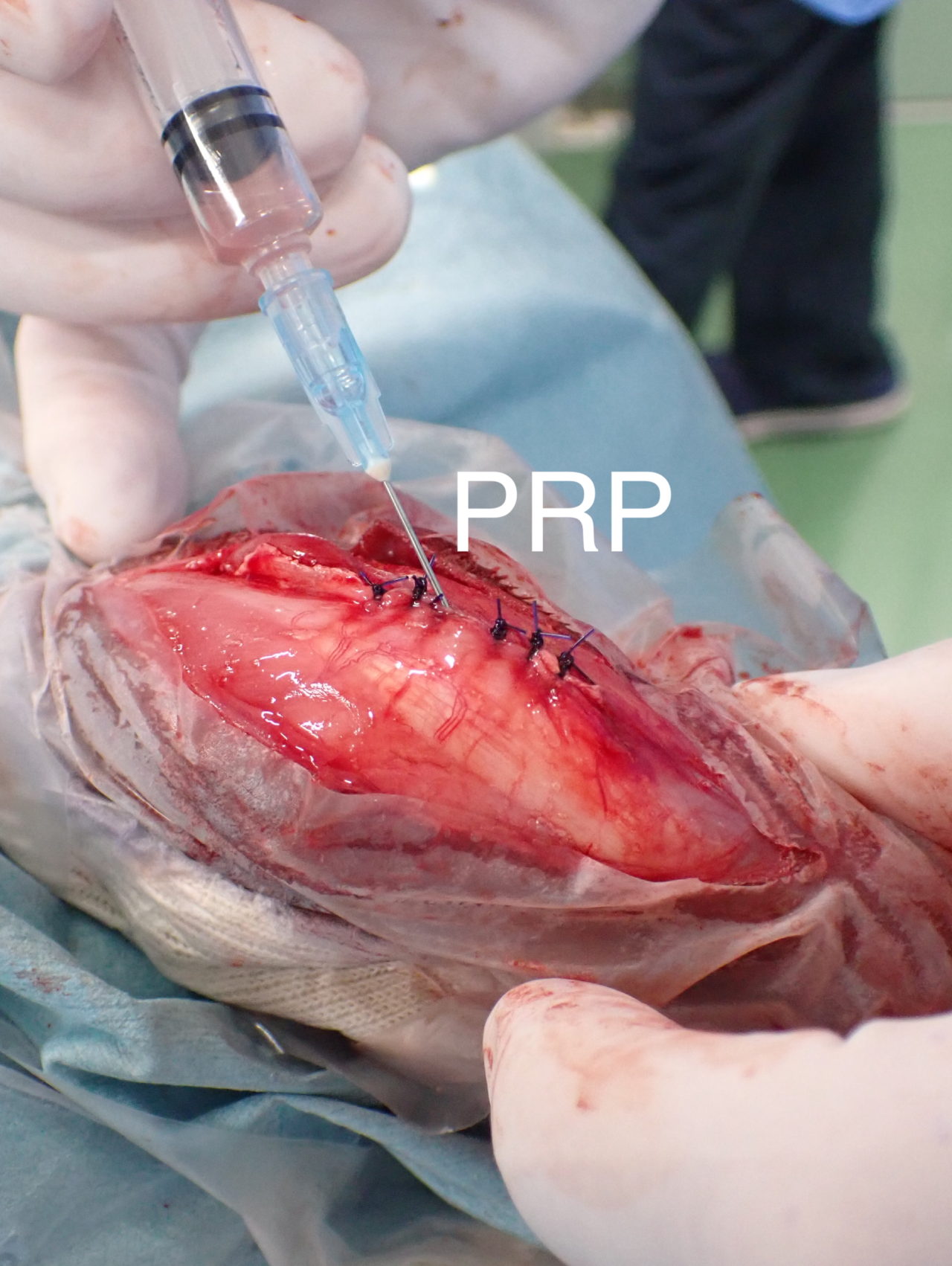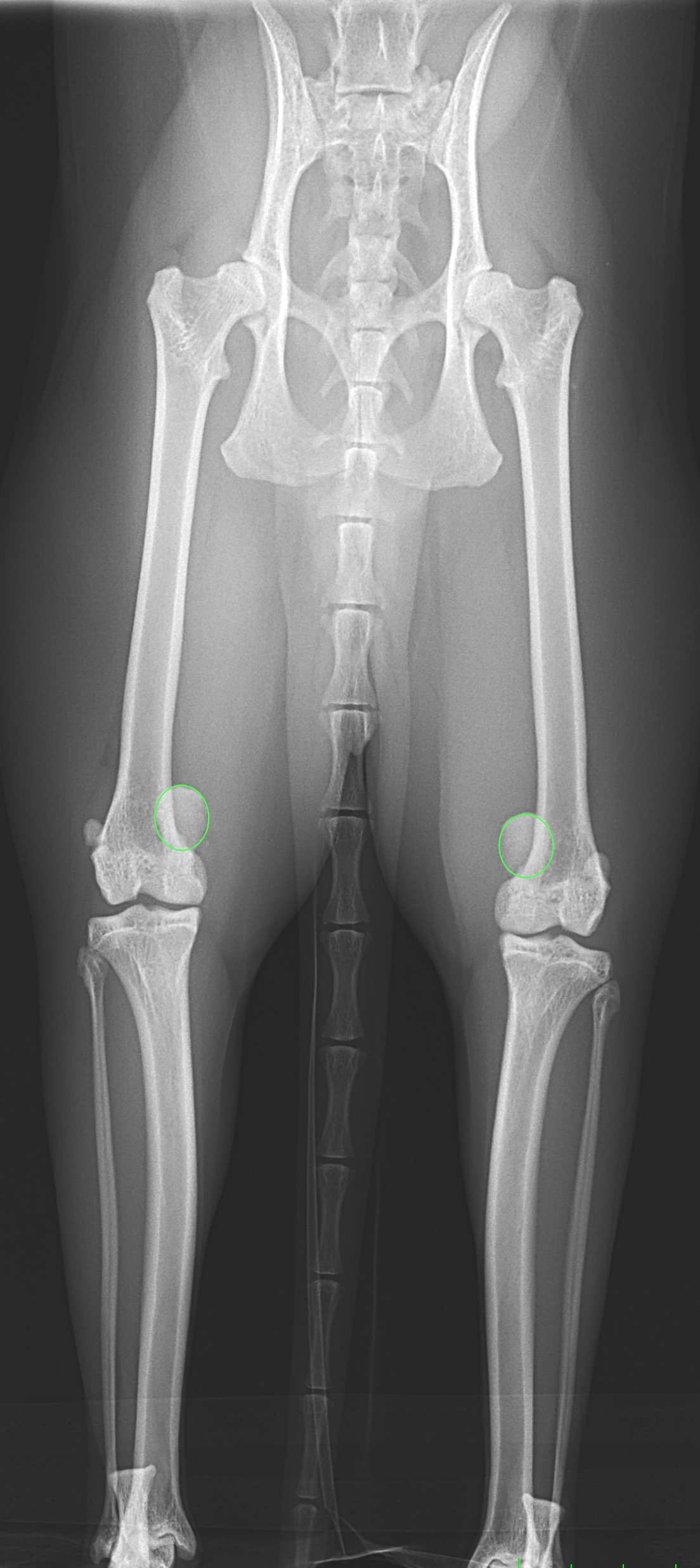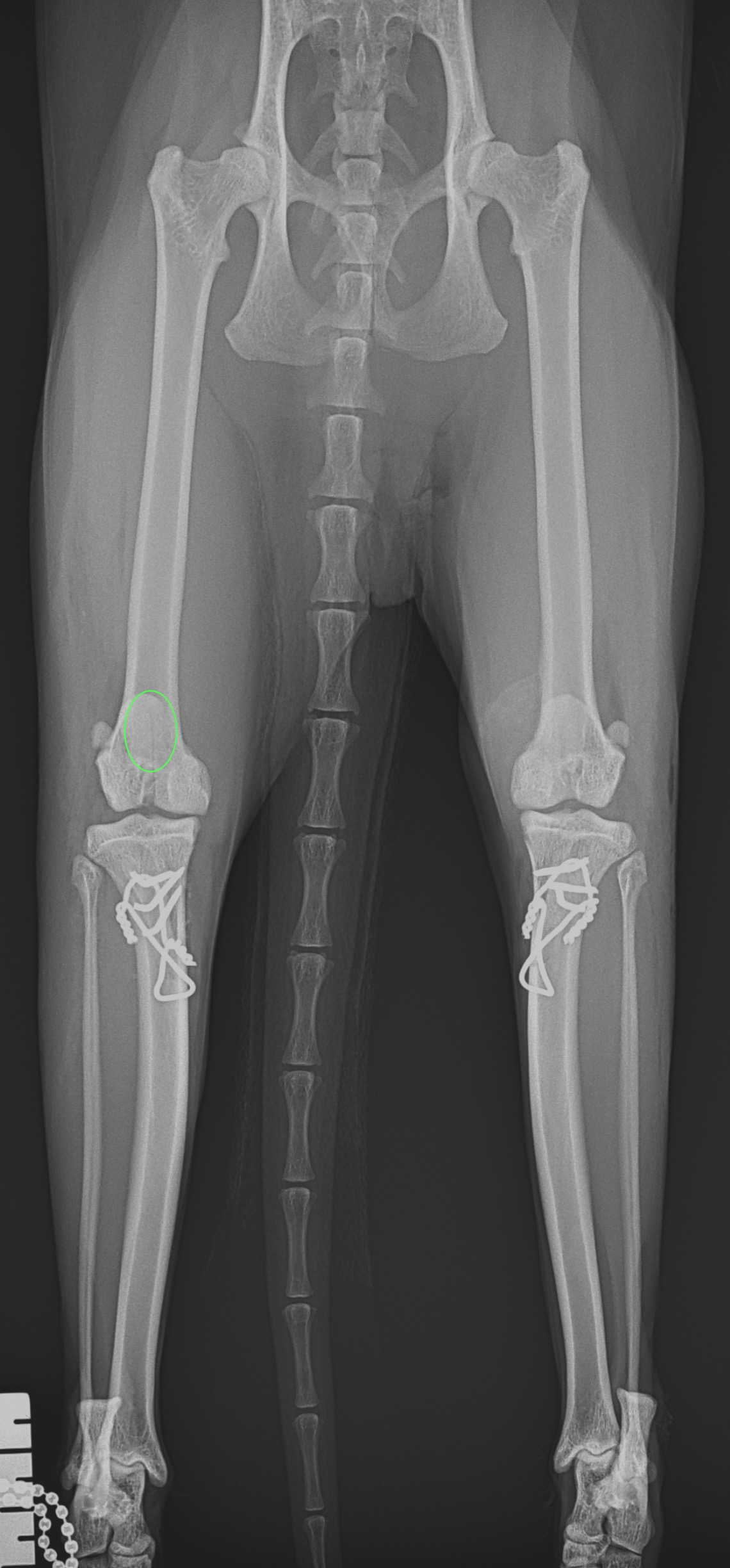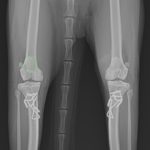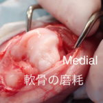 猫も犬と同様に膝蓋骨の問題は起こります。習慣性の膝蓋骨脱臼による異常なメカニカルによる負荷が関節軟骨に生じています。外科的に大腿骨滑車深化術、脛骨粗面移行術によるアライメント手術を行います。また、内科療法としてPRP:自己多血小板血漿を関節内に投与、レーザー照射、カルトロフェン・ベット、NSAIDs、アンチノールなどのサプリメントを継続します。