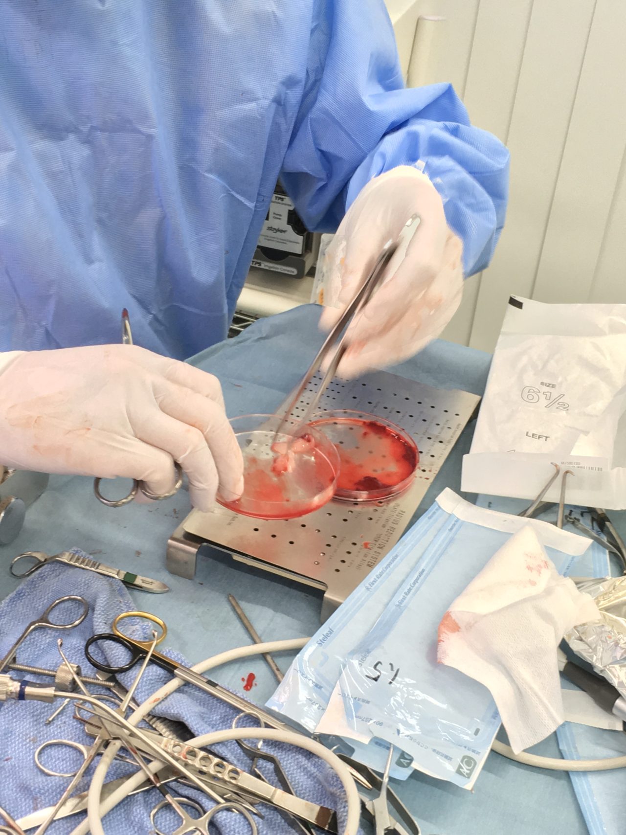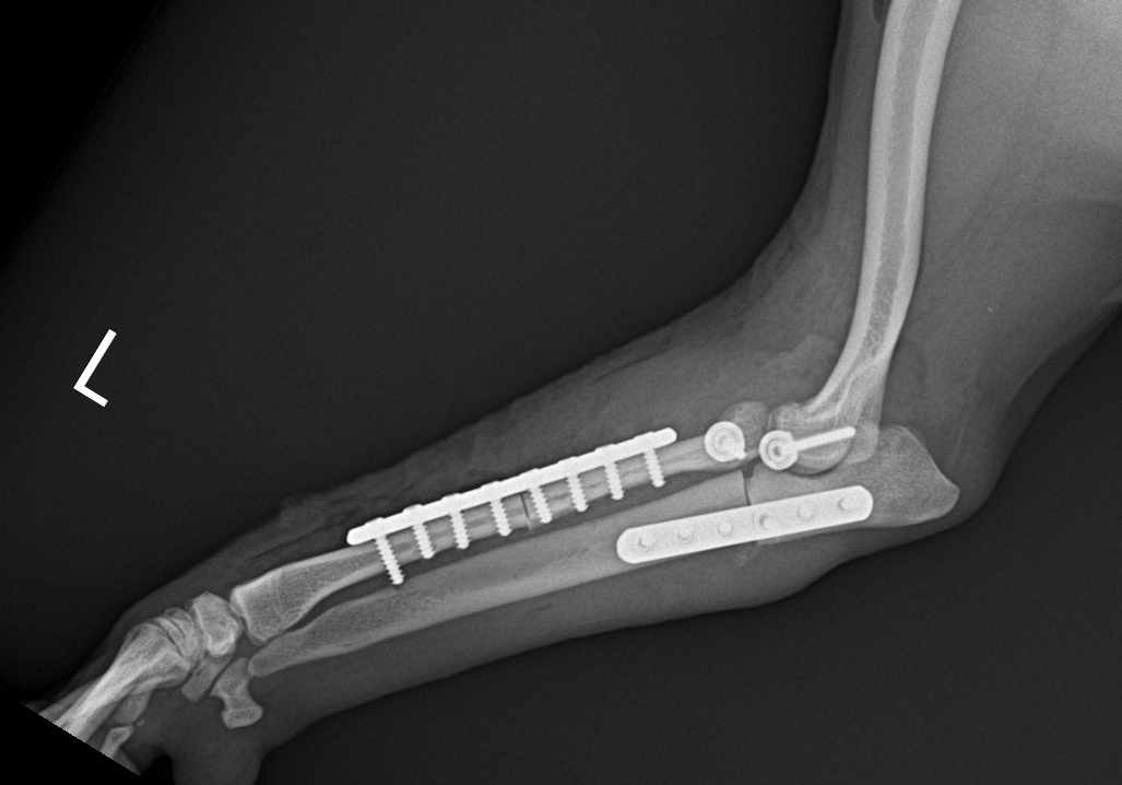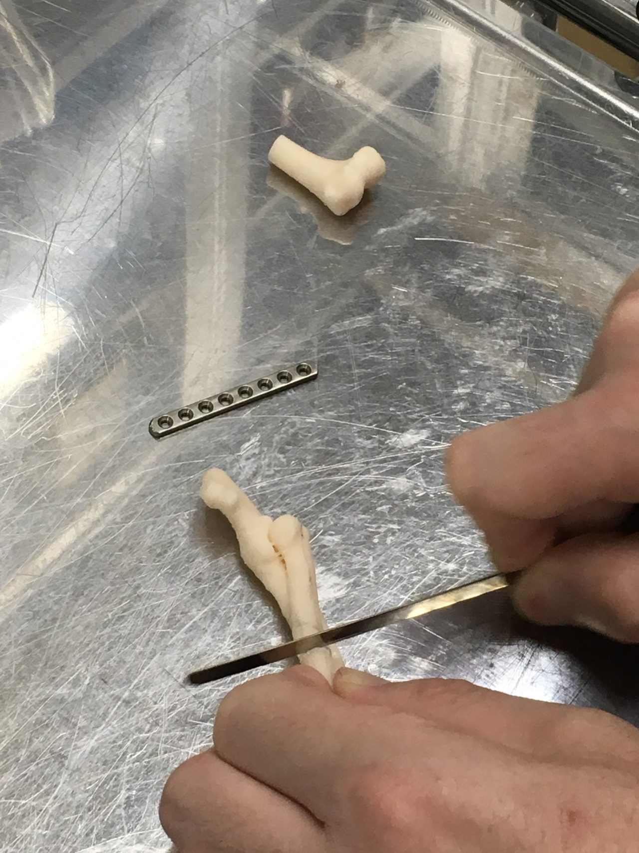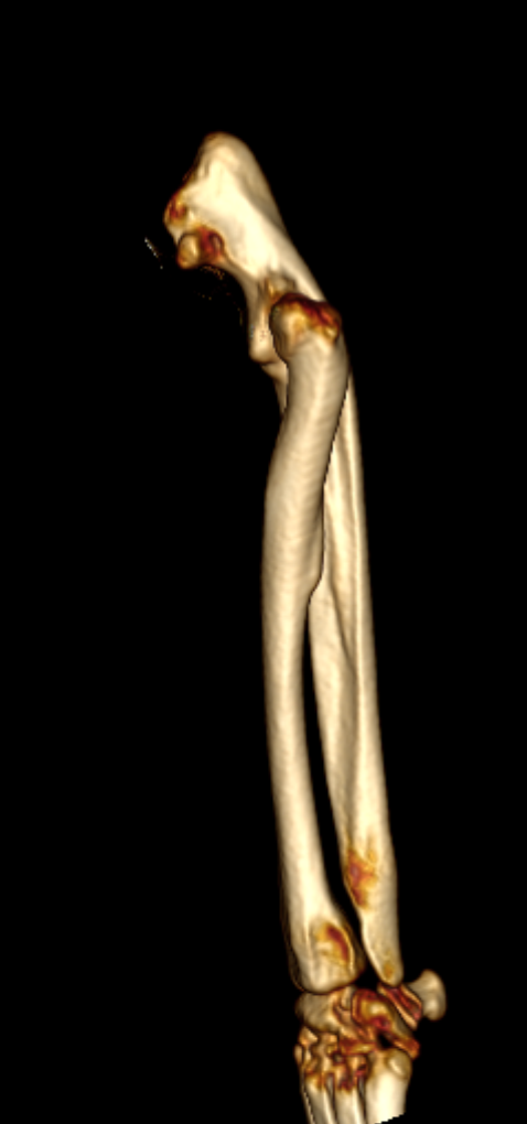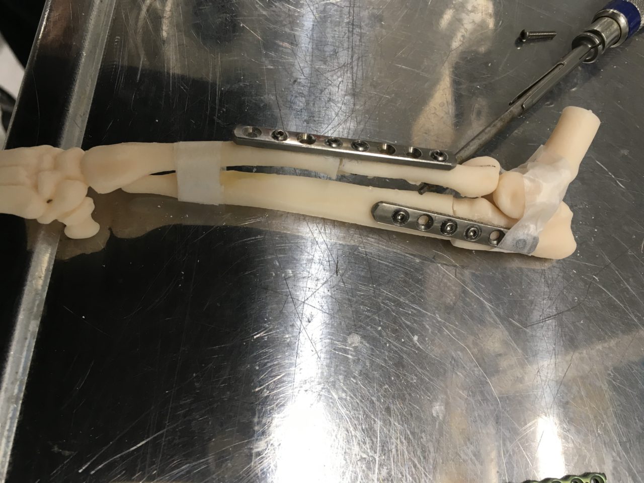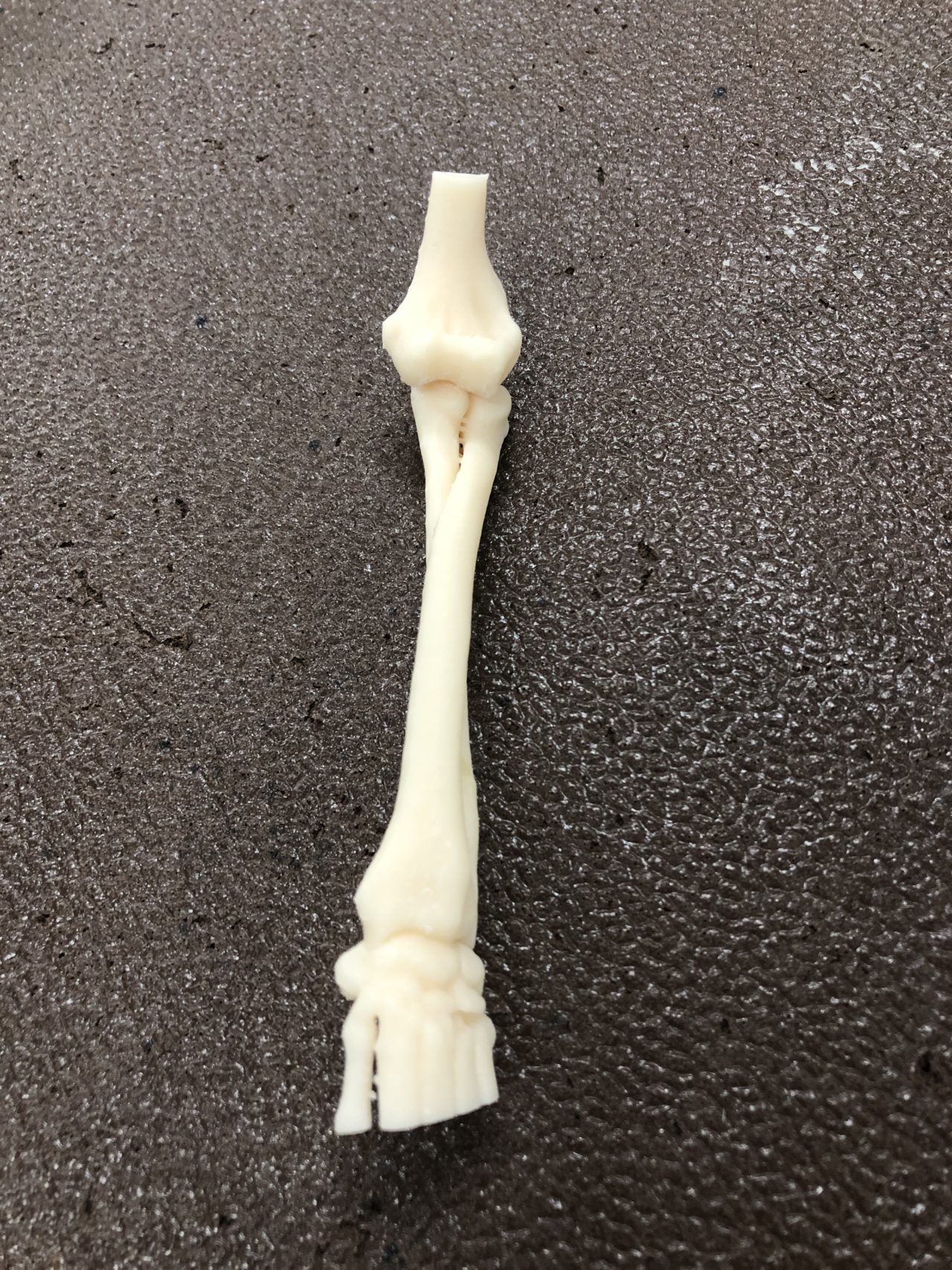 2歳の柴犬ちゃんが、生まれてすぐに痛めた肘に徐々に痛みが出てきたとのことで、主治医から診察と必要があれば手術をして欲しいと連絡がありました。CTでは橈骨頭が外側に脱臼して変位していました。また回転性の変形を伴っています。同時に尺骨にも湾曲が認められています。このような変形矯正には3Dプリンターで模擬手術を行いあらかじめシミュレーション手術をしておくと時間の短縮と正確な変形矯正が可能となります。このようなテクノロジーを動物医療にもどんどん取り入れていきたいと思います。また、骨きり部位にはPRFと自家海綿骨移植を行い治癒促進を期待します。