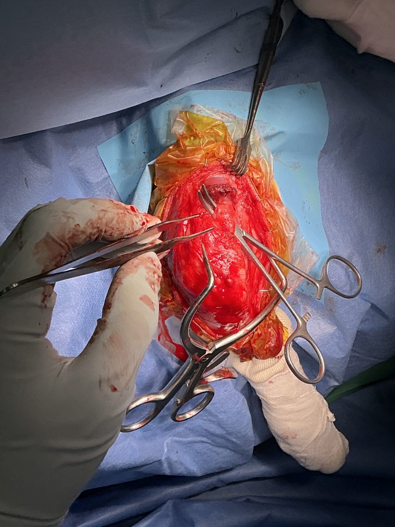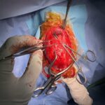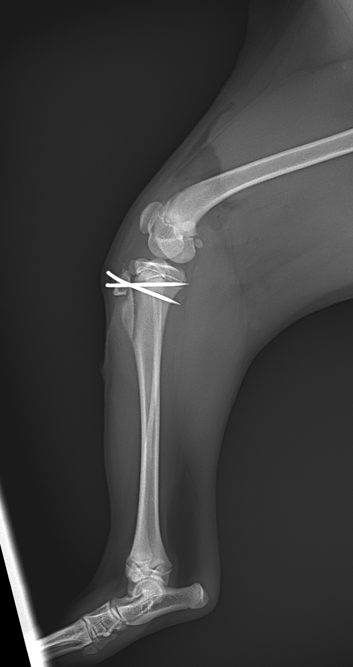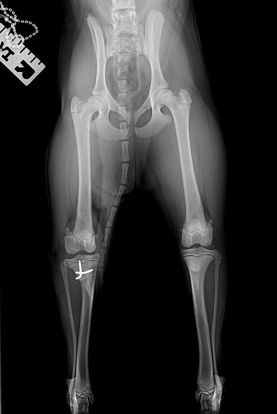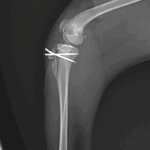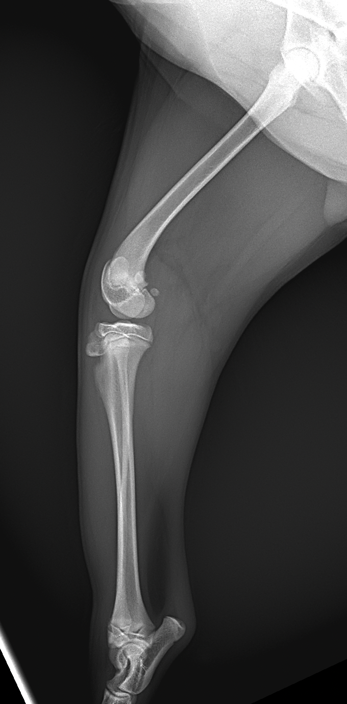 膝蓋骨内方脱臼G4により右後肢の負重が弱いという患者さんが紹介受診されました。膝蓋骨は大腿骨滑車から脱臼したままで大腿骨滑車内に誘導することができませんでした。大腿骨の変形などは幸い確認されませんでした。大腿骨滑車形成術、内側広筋の切離、脛骨粗面外側移行術、外側余剰関節包の切除によりアライメント手術を行いました。これから後療法も重要になります。