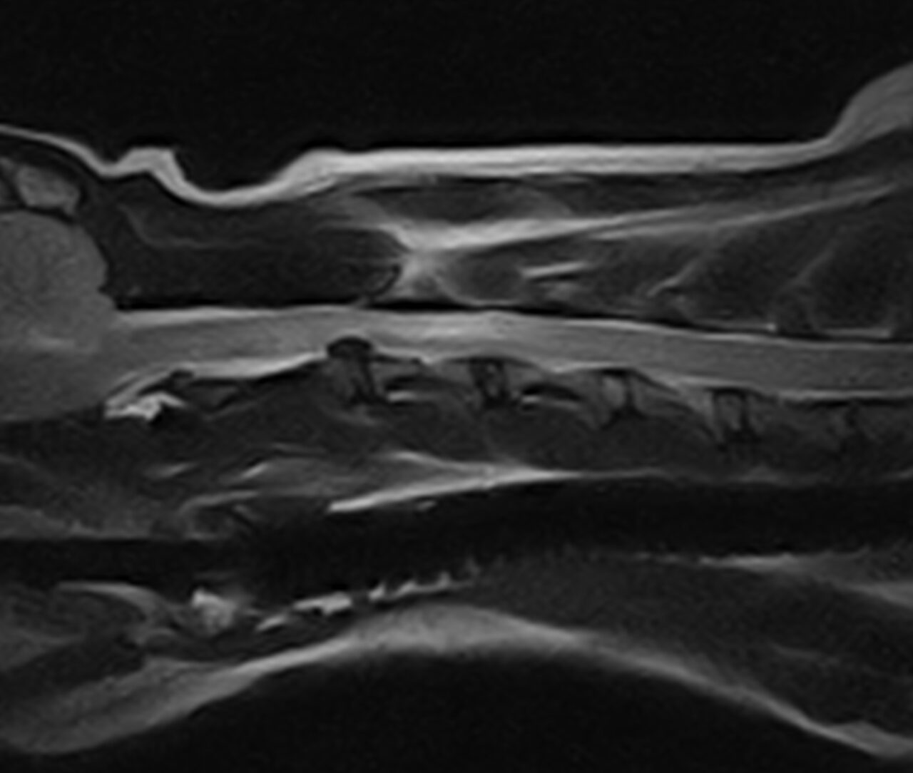 腰のヘルニアが疑われていましたが、歩様観察を行うと前肢にも運動失調症状が確認され、頸部脊髄疾患と判断しMRI撮影を行いました。