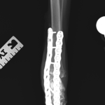 足根関節を適切な角度で固定し、関節面のバーリング、チタン製の2.7 ロッキングプレートをOrthoganal 方向で2枚用いて強固に固定し、早期の荷重を目指します。