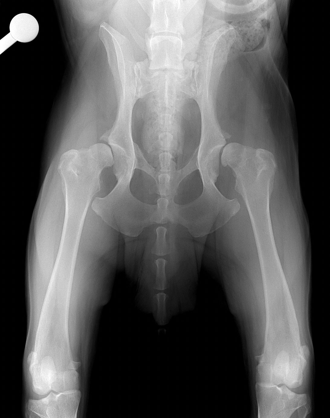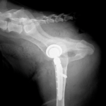 45kgの大型犬が股関節形成不全による痛みがあるとの事。他県より紹介来院されました。KyonのTHRシステム(人工関節)で傷んだ関節を置換しました。関節炎による痛みを感じるのは人も動物も同じです。出来るだけ痛みのない生活を過ごしてもらいたいと思います。インプラントはCup AOL 42° Large STEM 17°、Head19mm、Neck S、29.5 、Cup Anteversion 30°で埋入されています。内科治療に反応のない骨関節炎には人工関節で対応する事も可能です。しばらくは安静が必要です。