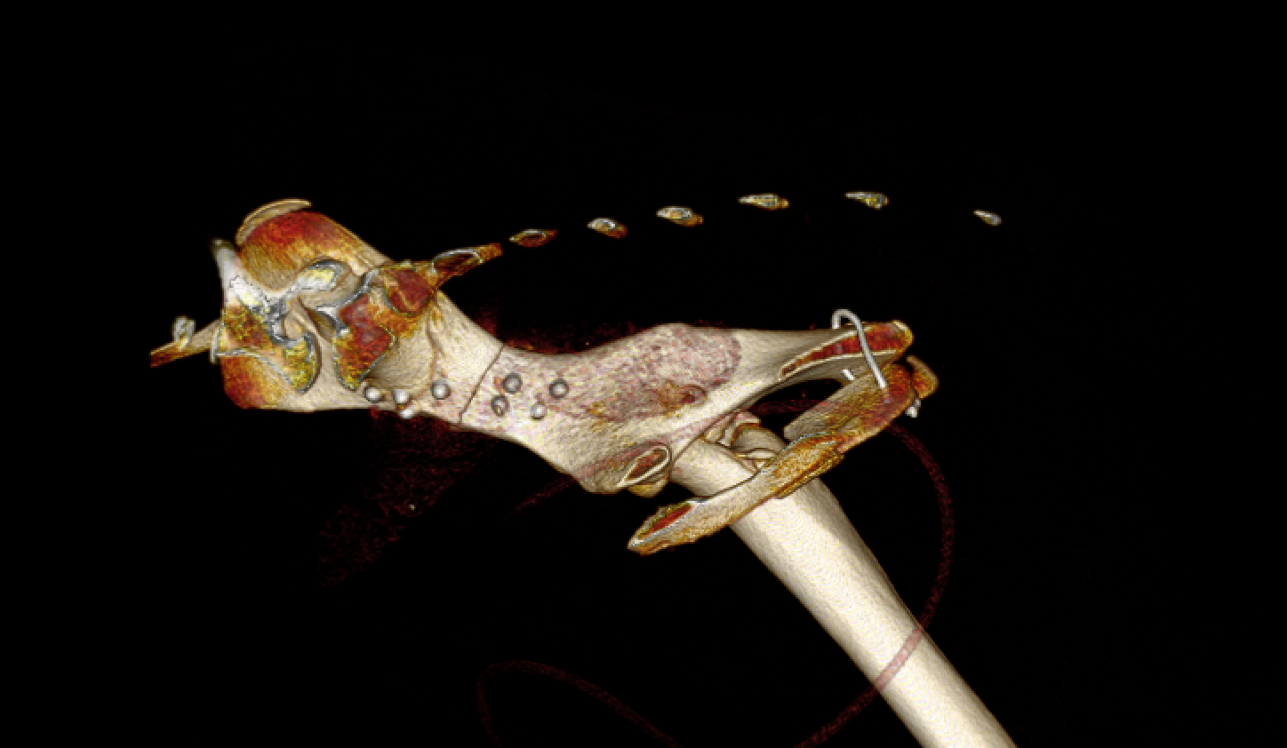 ※患者さんは7ヶ月齢のワンちゃんです。手術直後はまだ関節内に骨頭が納まりませんが徐々に寛骨臼内に収納されることが期待されます。