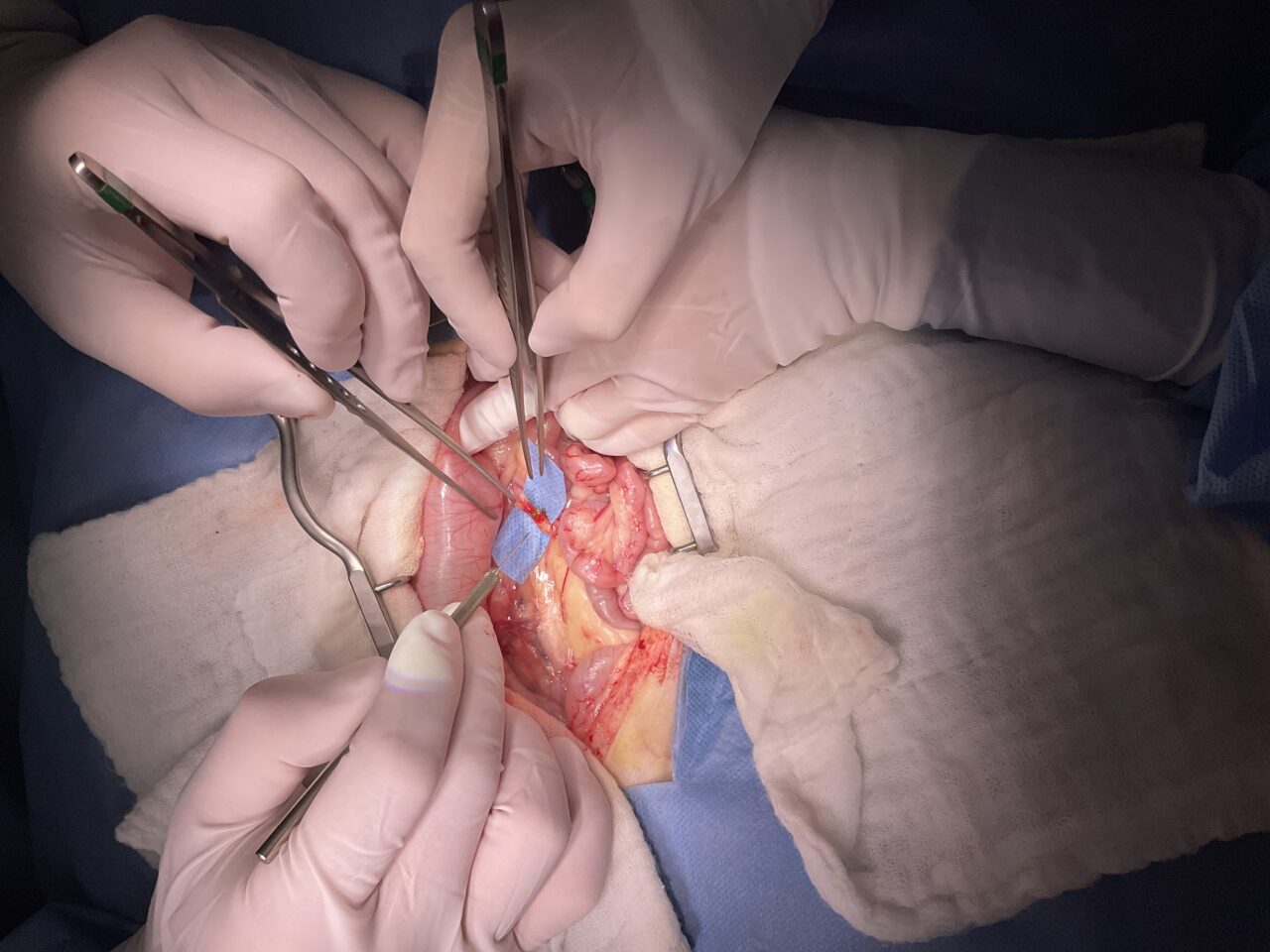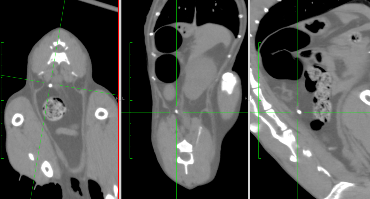 高齢の猫さんがかかりつけで慢性腎機能障害の治療中に急に腎数値が上昇したとのこと。精査を希望されて来院しました。CTで精査を行うと両側の尿管結石が確認され、顕微鏡下で両側の結石を摘除しました。術後数日は腎数値が改善しませんでしたが10日目頃より徐々に数値の改善とともに元気も出てきました。高齢ながら頑張ってくれました。