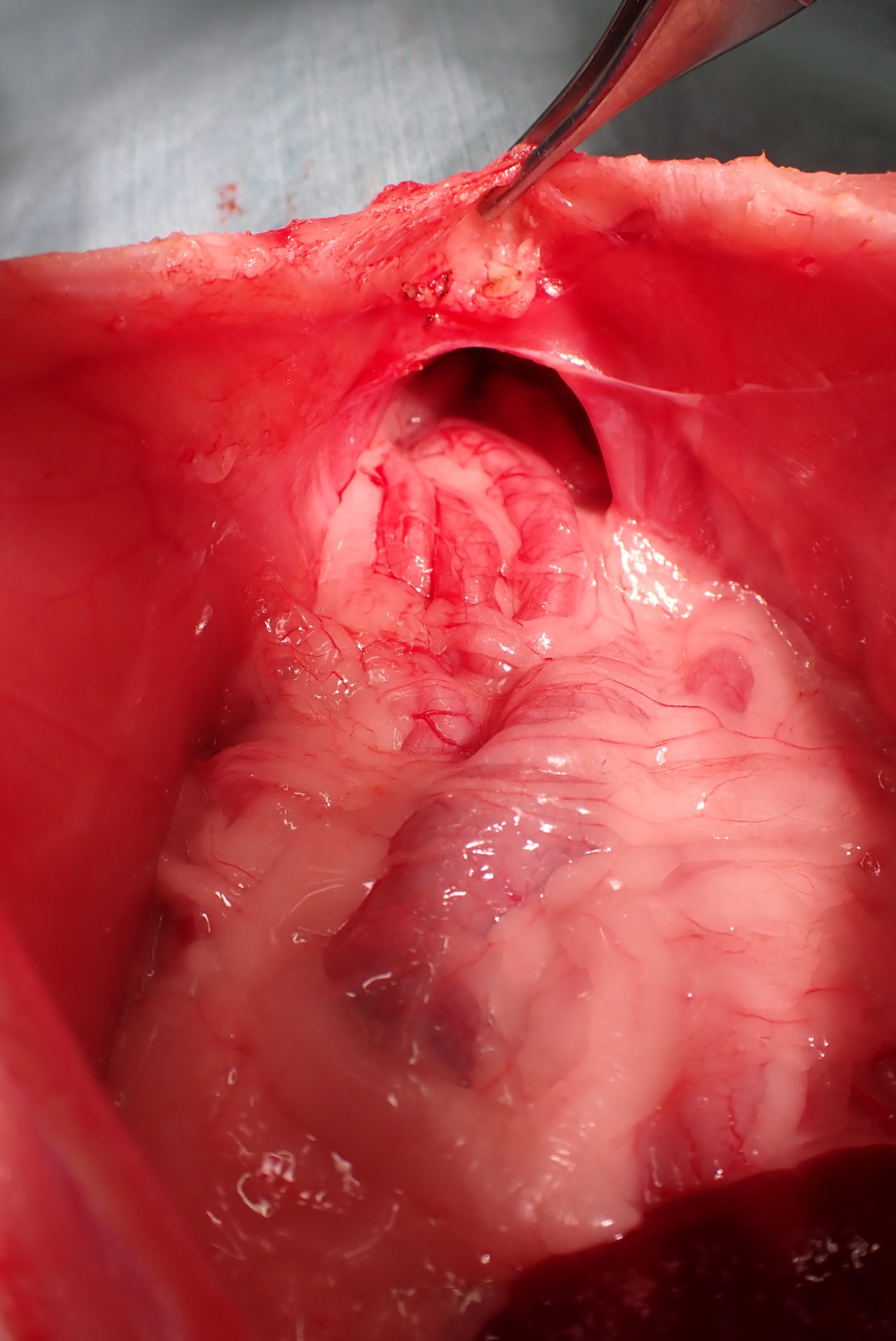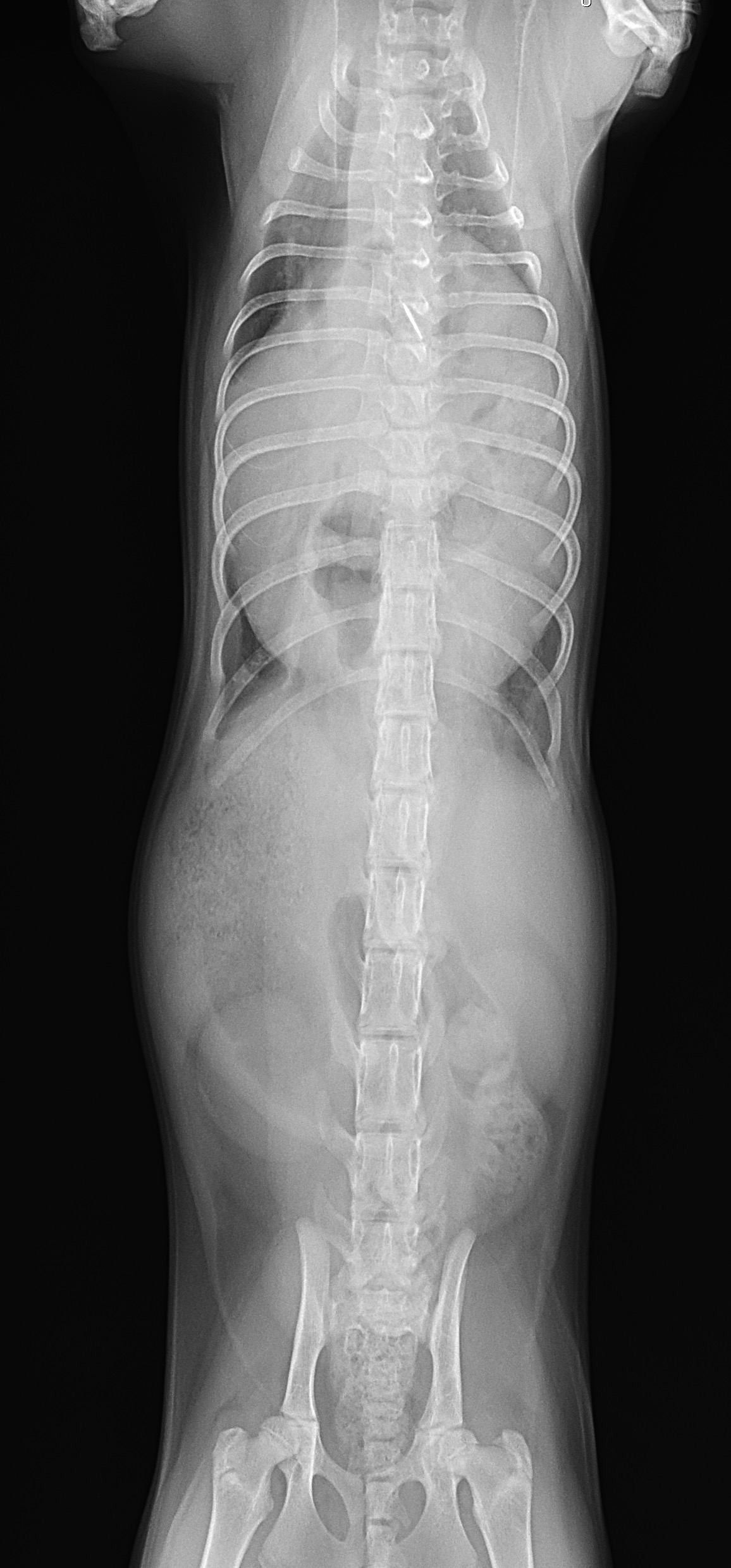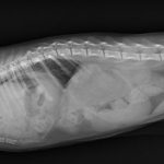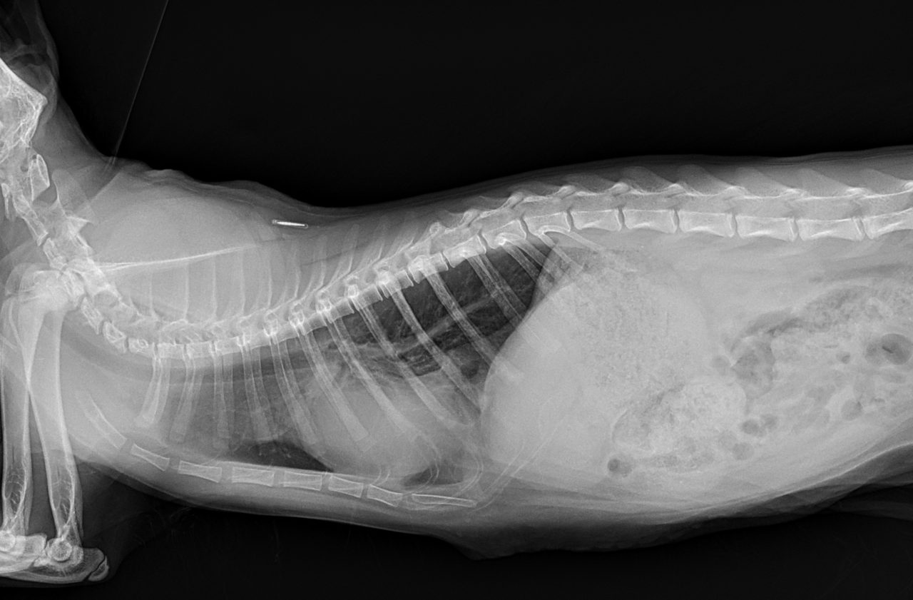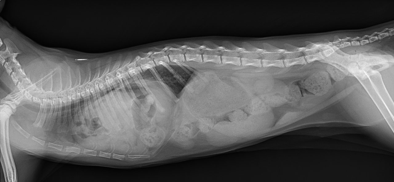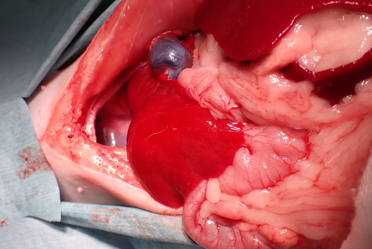 若い猫が、普段はとても元気だけど、遊んだ後などに咳をする。呼吸が早くなる時がある。などの呼吸器症状で主治医を受診しました。エックス線検査の結果、心嚢横隔膜ヘルニアと診断されました。主治医より、外科的な対応のため紹介受診となりました。腹部正中切開の後、心嚢内に逸脱した、肝臓、胆嚢、小腸を腹腔内に戻し、横隔膜を再建しました。術後には、再拡張性肺水腫という病態が発生する可能性があるため、24時間体制で、患者さんを見守ります。幸い、肺水腫の傾向はみられず、5日目に無事に退院となりました。周術期には一時的に低酸素症に陥ったり、二酸化炭素濃度が上昇したりと、不安定な場面もありましたが、小さな体で本当によく頑張ってくれました。これで、普通の子猫としてどんどん大きく成長してくれると思います。本当によかった。