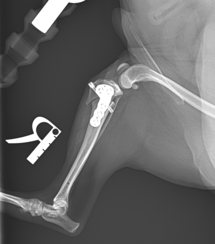 抜糸までの2週間ケージレストで安静にしていただきました。歩行の様子では、患肢を挙上させていることが多く負重がかなり弱いです。