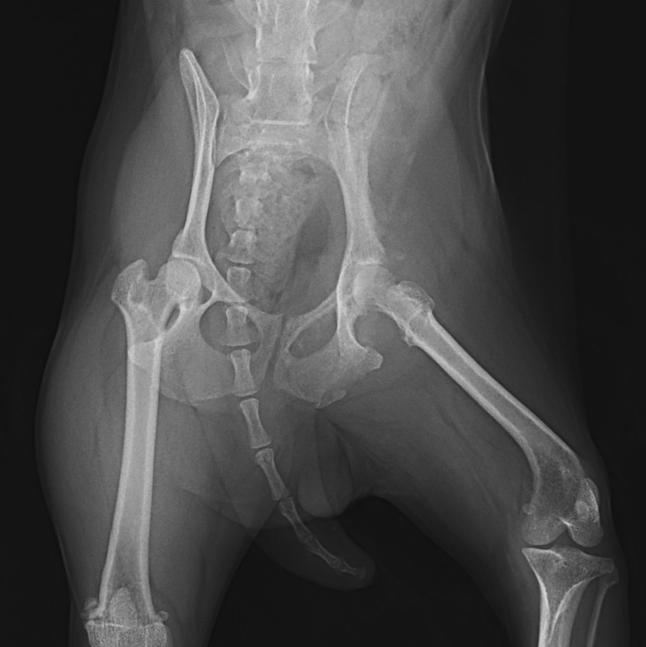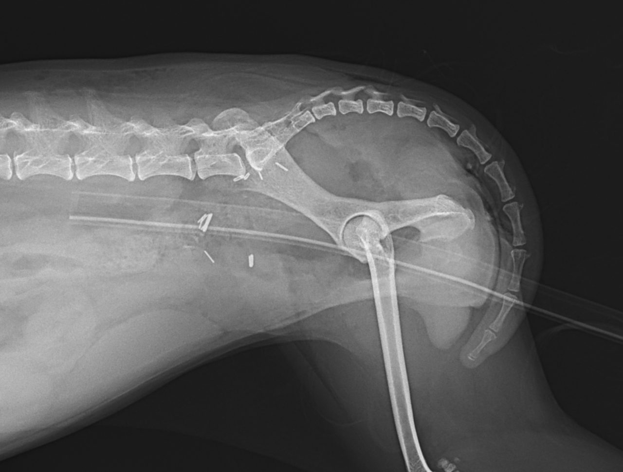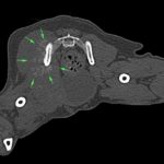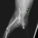 鎮痛剤で跛行が改善しないワンコの精査依頼がありました。CTでは股関節(主に腸骨)に骨融解像が確認されました。細胞診では悪性腫瘍と暫定診断が行われました。除痛のため半側骨盤切除で対応しました。後肢を失うことは大変辛いことですが、ワンコは痛みがなくなり快適に過ごせているそうです。一見、整形外科に見えても高齢犬には腫瘍が隠れていることがあるのでCTによる精査は大変有効です。