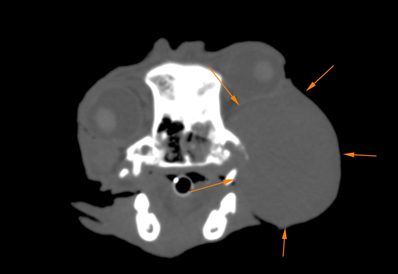 CT検査を行うと腫瘍はすでに上顎骨を破壊し、眼下へ浸潤していました。