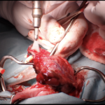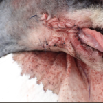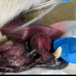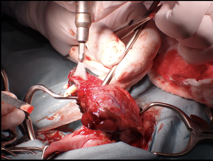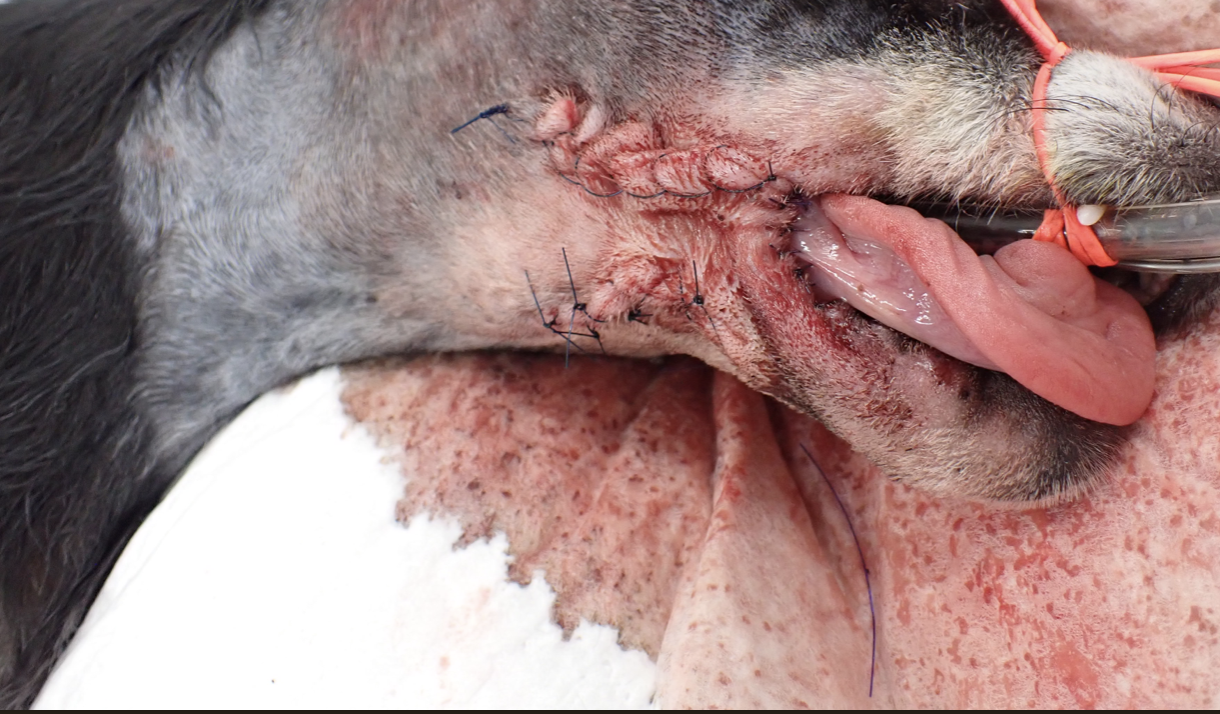 14歳、雑種犬、去勢雄のワンちゃんが、口腔内腫瘤の精査のため来院されました。CT検査および腫瘤の組織生検を行い、悪性黒色腫と診断。腫瘤は歯肉から発生しており、完全切除を達成するには下顎骨ごと取らなければなりません。画像検査上明らかな転移は確認されなかったため、右下顎骨全切除および下顎、内側咽頭後リンパ節の切除を行いました。3日後から自力での食事、飲水が可能となり、術後4日後に退院しました。術後は抗がん剤感受性スクリーニング検査に基づき、分子標的薬での治療を行っています。大変な手術でしたが、よく乗り越えてくれました。
