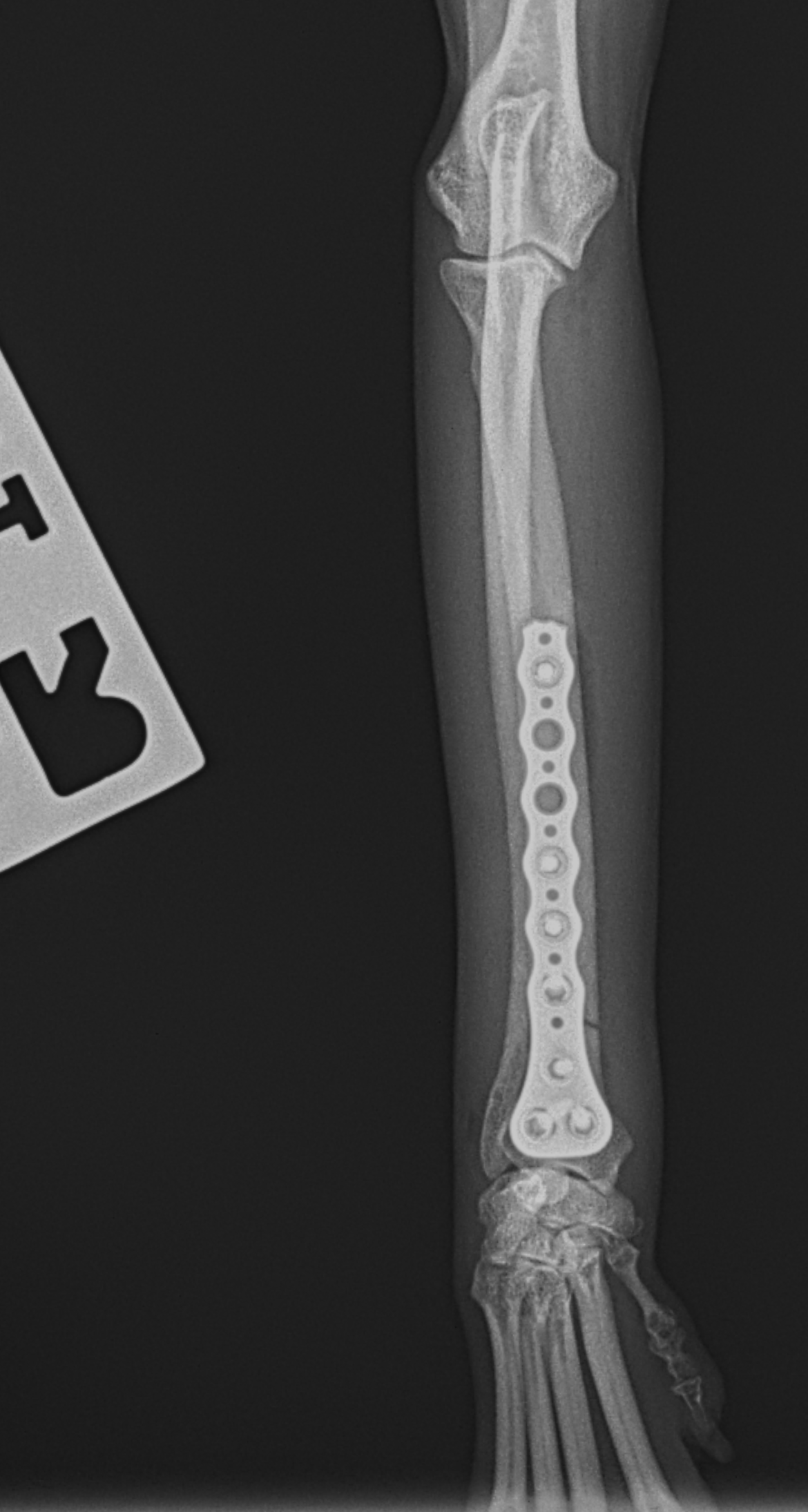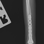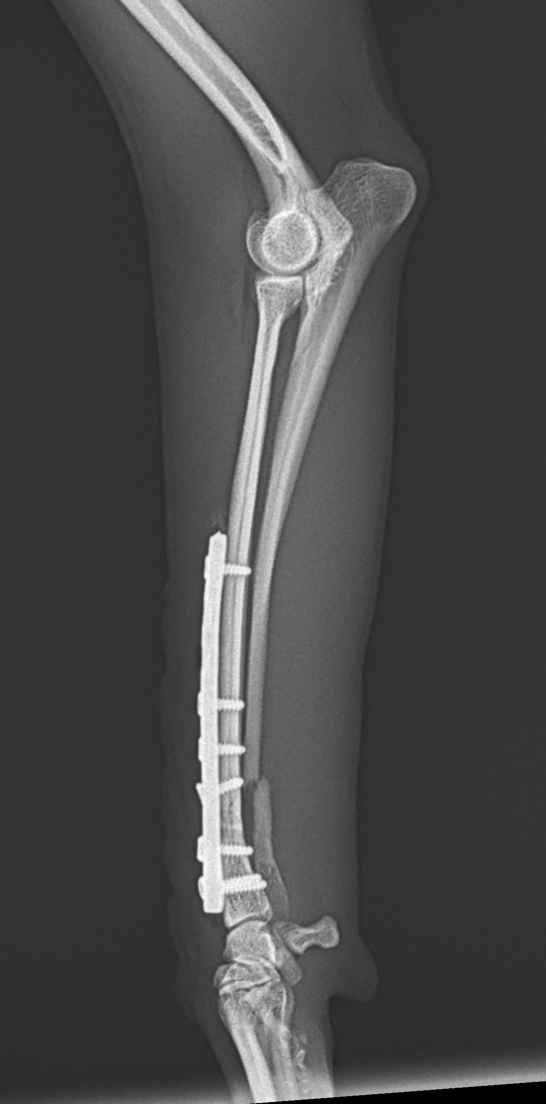 Toy Poodleさんが室内で転倒して骨折したとのことでかかりつけ医より整復依頼がありました。遠位端骨折です。T style Titanium Plateにコンベンショナルスクリューとロッキングスクリューを組み合わせて骨接合術を行いました。しばらくは安静が必要です。