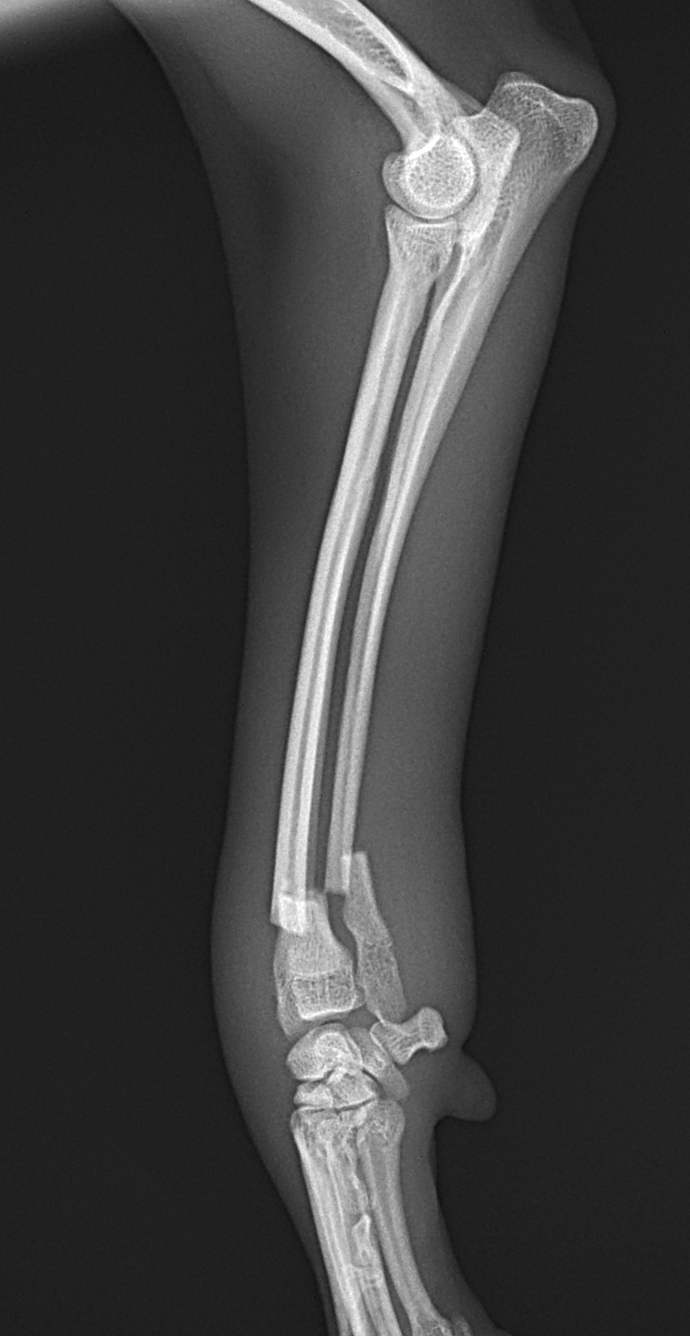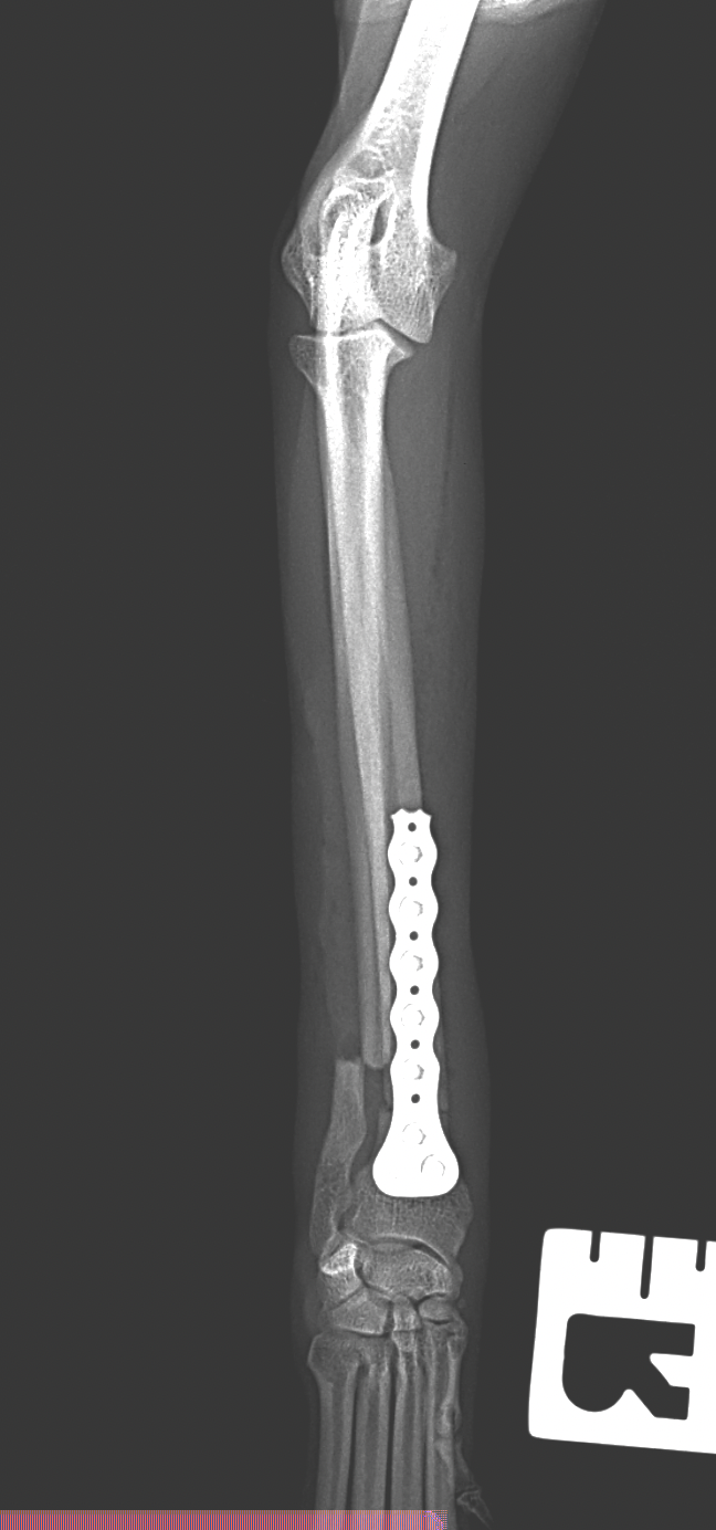 小型犬が室内でジャンプして着地に失敗し、前肢を痛がり始めたとの事。かかりつけ医で橈尺骨遠位端骨折が確定されました。整復を目的に当院を受診されました。1.5 Titanium Locking Plateを用いて固定術を行いました。しばらく安静が必要です。