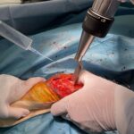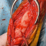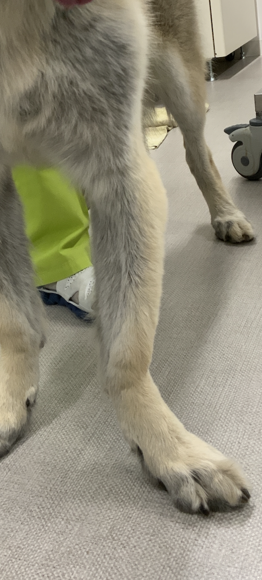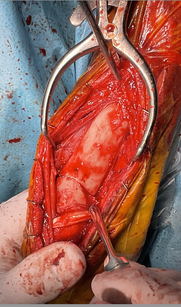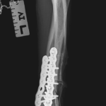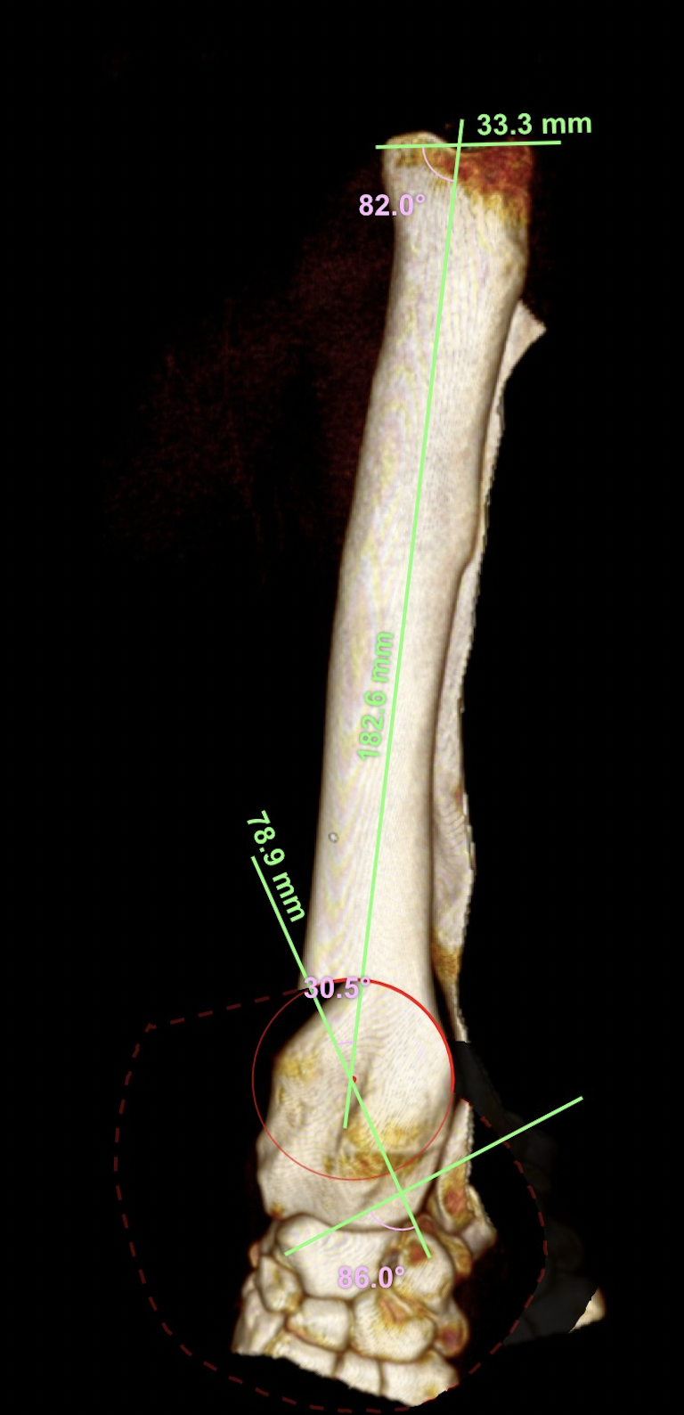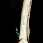 大型犬の橈骨遠位変形矯正をPaley’s ruleを元に、Center Of Rotation Angulation(変形中心角)を決定し、vPOPでシミュレーションを行い骨切り矯正術を行った。機能軸もしくは解剖軸を骨軸上に配列できなければ2次的な変形が生じてしまうリスクがある。橈骨遠位のCORAを中心にラウンドオステオトミーを実施3.5 Locking PlateでOrthogonal法で整復固定を行う。このテクニックでは骨切除を行わないので脚短縮が生じないというメリットがあります。