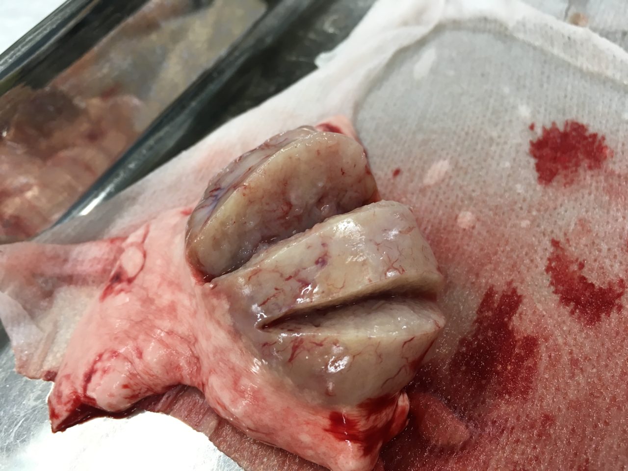 提出された左肺後葉腫瘤(5×3×2㎝)はマージン部に緑のインクを塗布して切り出し、