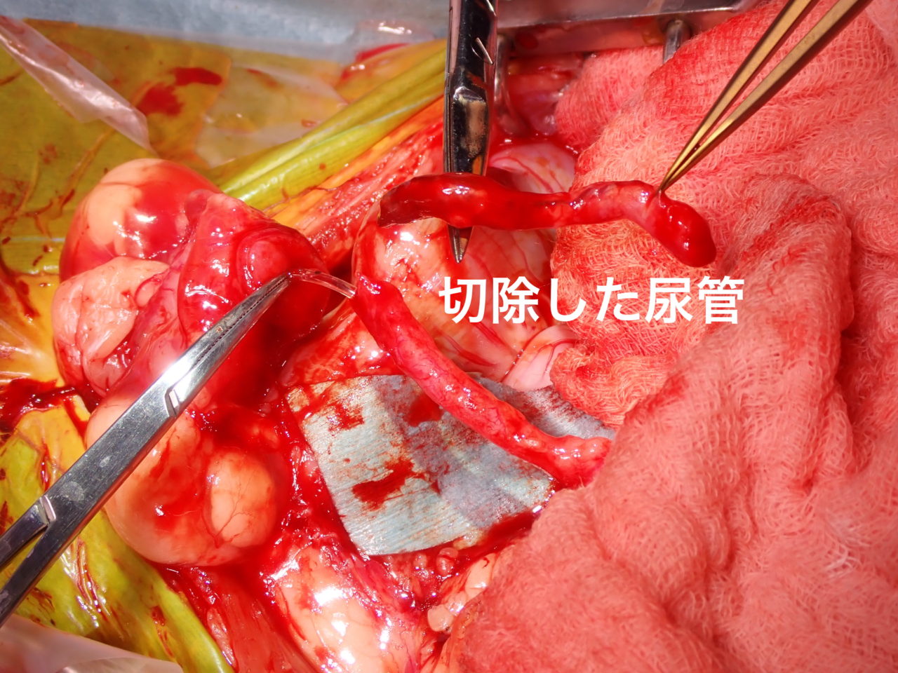 猫さんが尿管結石で腎臓の数値が上昇しているので何とかして欲しい。かかりつけの先生から連絡がありました。血液検査では腎数値が中程度に上昇しています。CTでは尿管内、腎盂内に複数の結石が認められており、尿管結石が閉塞→尿管炎→線維化→内腔の狭窄を呈しています。顕微鏡下マイクロサージェリーで狭窄した領域の尿管を切除し、膀胱と新吻合術を行いました。