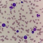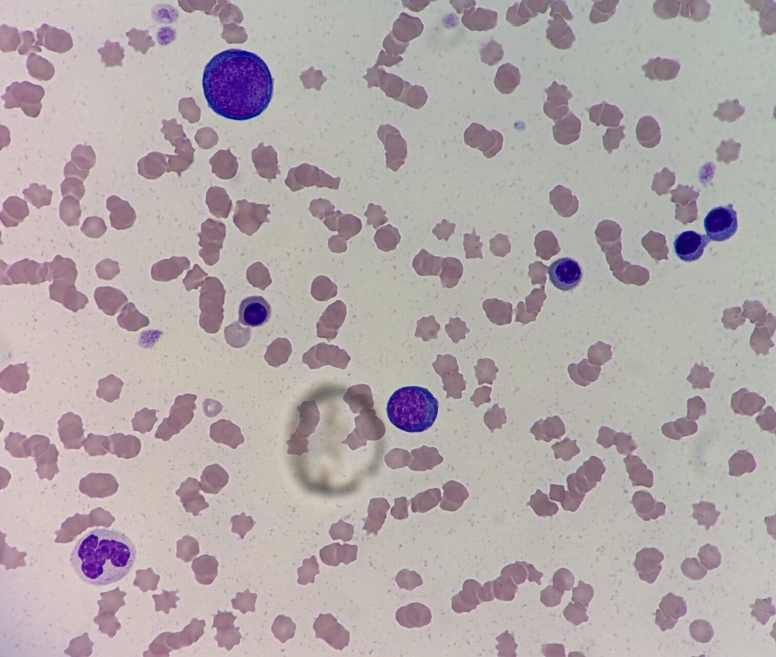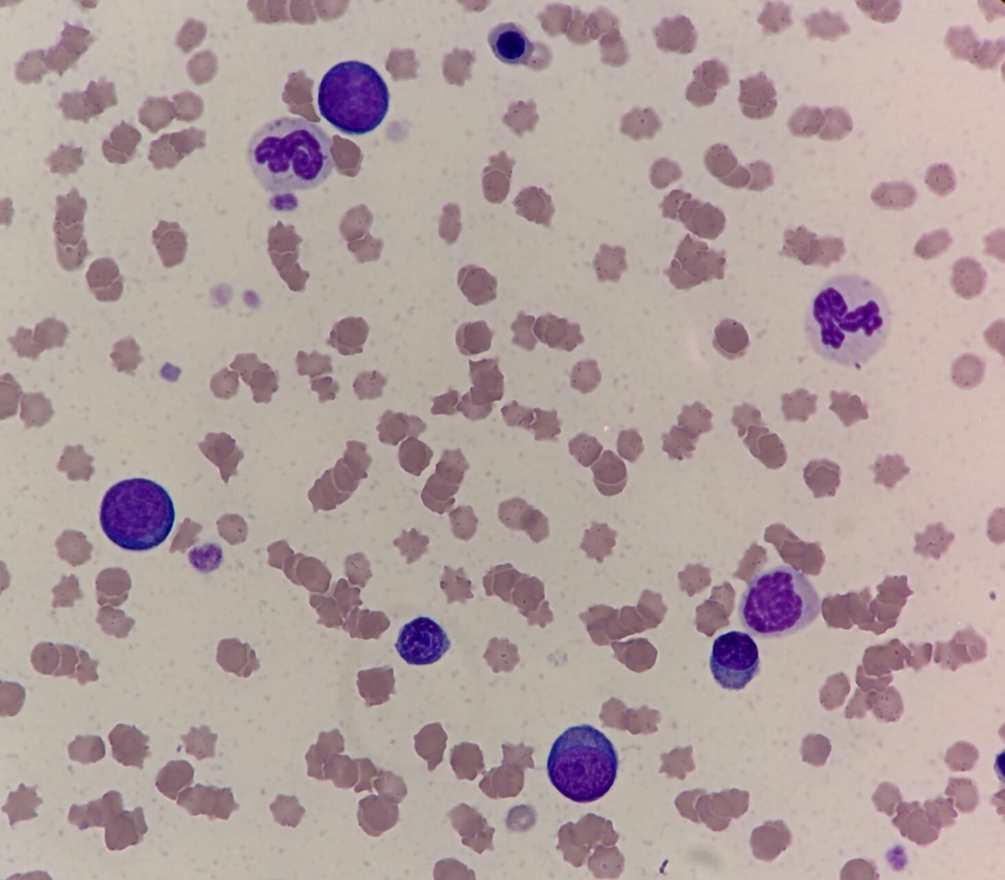 この患者さんでは赤血球を生み出す起源の細胞が血液中に出現していました。本来このような細胞が骨髄から末梢血中に出ることはなく腫瘍性(急性白血病)と診断しました。