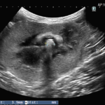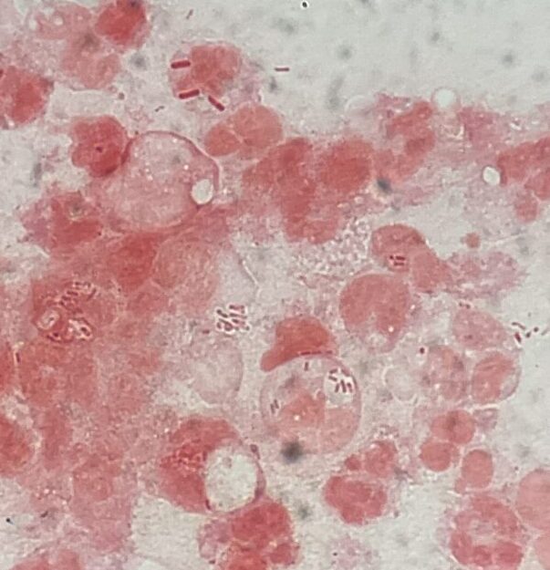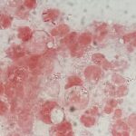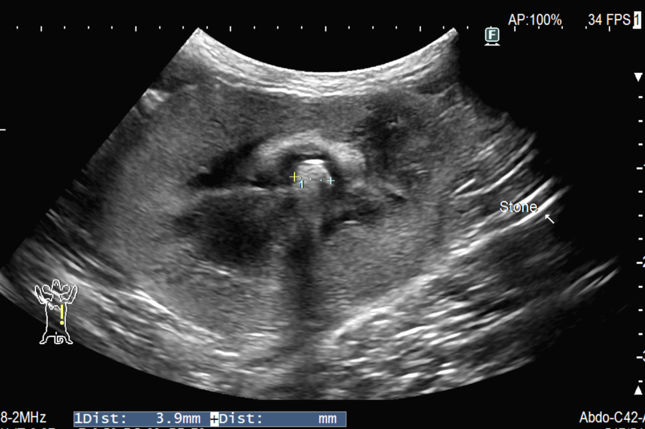 猫が尿路結石により排尿障害を起こしており、緊急の手術が必要とのことでご依頼を受けました。検査では右の腎盂・尿管が拡張しており、腎臓内に結石が認められます。鎮静下でCT撮影を行い、右尿管内に1mm程度の小さな石があることを確認できました。通常1mm程度の石であれば内科治療で膀胱へ流れてくれることが多いのですが、注意しなければいけないのは背景疾患です。腎盂穿刺を行い、腎盂尿を採取すると膿のような尿が採取されました。顕微鏡検査を行うと菌(大腸菌)が確認され腎盂腎炎と診断しました。幸い抗生剤が効く菌であり、数日の入院ののちに元気になり退院してくれました。1ヶ月検診でも尿の流れは問題なくかかりつけ医にお戻りいただいています。