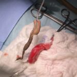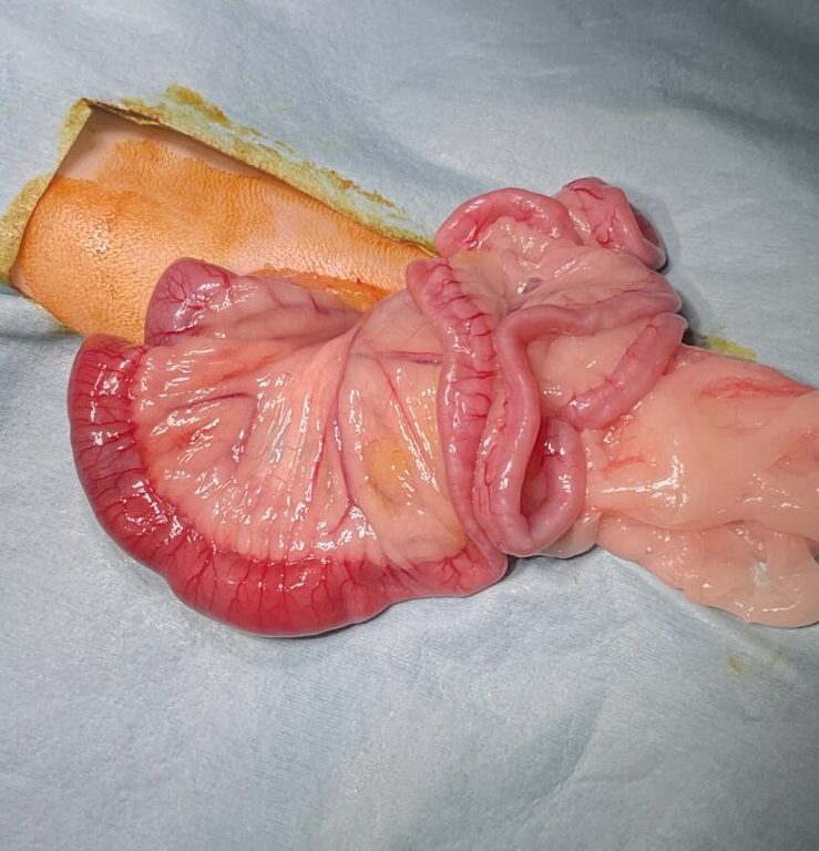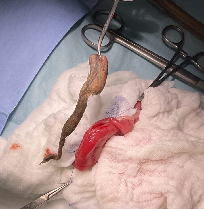 残念ながら内視鏡では届かない部位でしたので、腸切開を行い、異物(毛玉)を摘出しました。