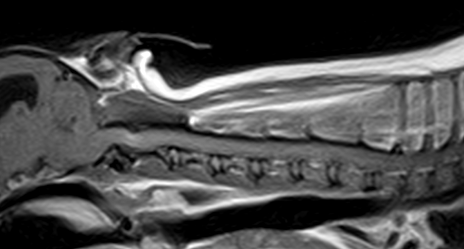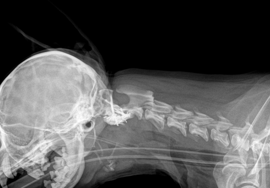 かかりつけの先生から、3歳のチワワが悲鳴をあげて、首を痛がり、歩けなくなっているので、すぐにMRIを撮って原因を調べて必要があれば手術をして欲しいと連絡がありました。すぐに来院され、神経学的な検査とCT・MRIを実施したところ、環椎と軸椎の不安定症が原因とわかりました。すぐに頸部にコルセットを着用し、状態を安定化しました。翌日には小康状態を得ていたので、環軸固定術を行いました。