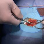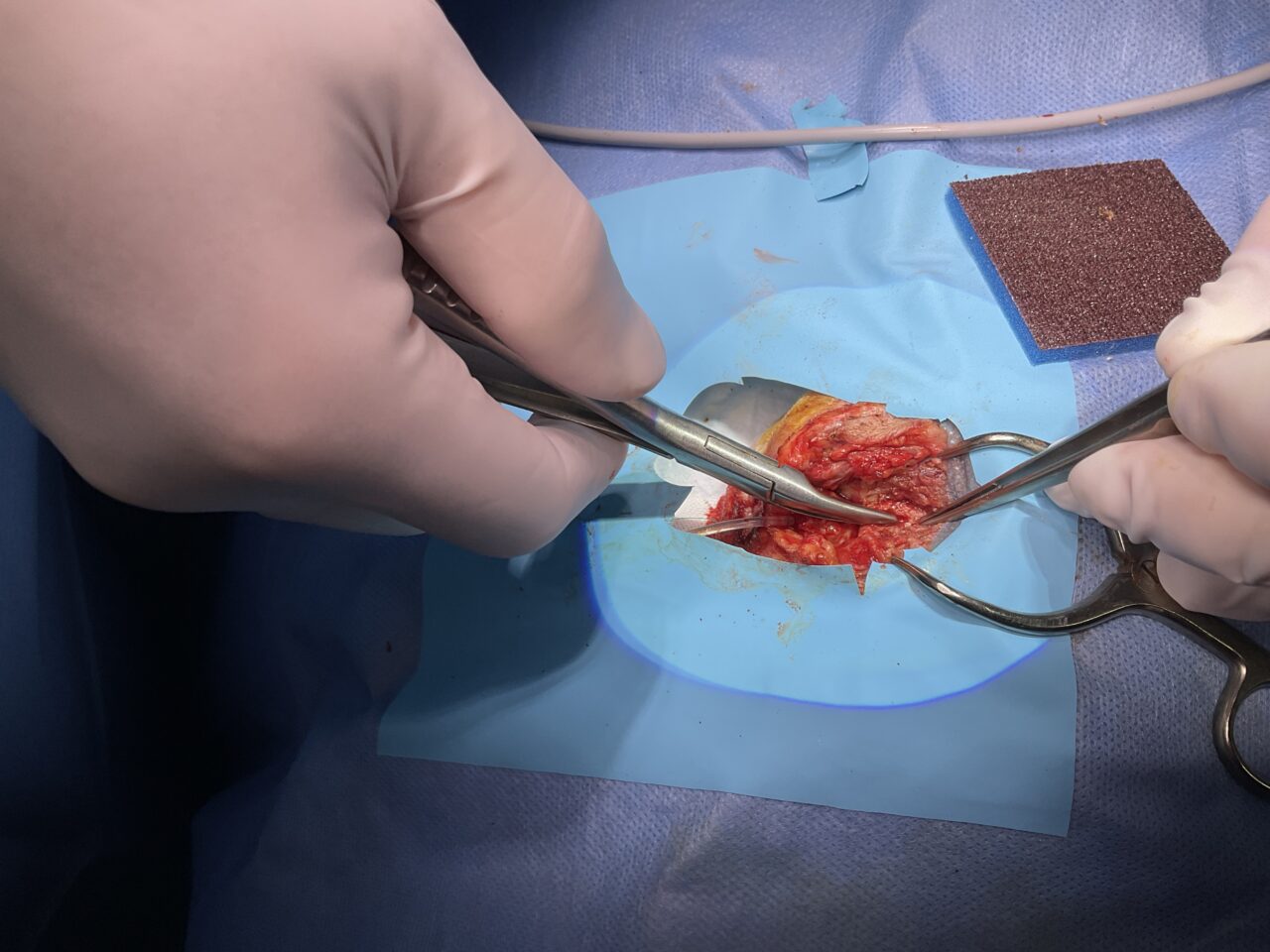 雄猫が尿道閉塞を繰り返しており、その都度尿道カテーテルで閉塞を解除していたが、慢性経過により尿道が損傷を起こして導尿が出来なくなったとのこと。尿道の損傷部位が骨盤腔に近くなればなるほど難易度は上がります。恥骨骨切り術により尿道を反転させ開口し、皮膚と粘膜縫合により尿路再建術が可能となりました。会陰尿道瘻設置術の救済としてもこの術式を採用する場合があります。