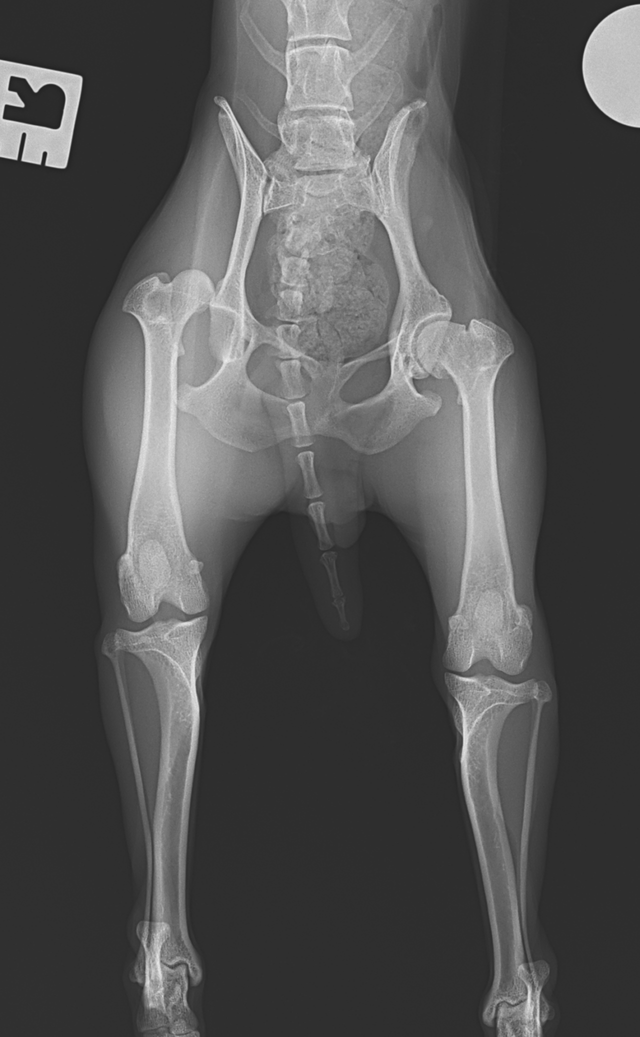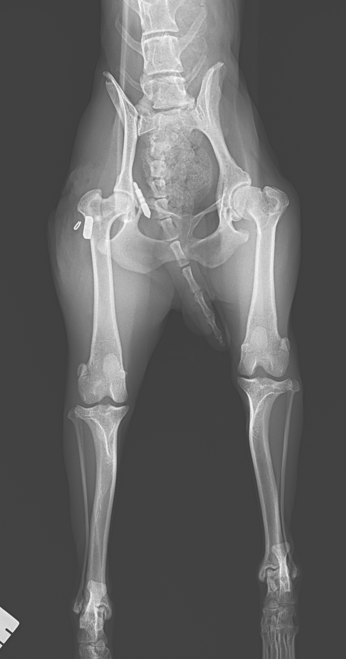 トイ・プードルが室内で転倒し、股関節脱臼を起こしたとのこと。失われた股関節機能を取り戻すために、大腿骨頭靭帯をもっとも生理的な方法で再建する”Toggle Rod法”で対応しました。シンプルかつ短時間で施術が可能です。外側アプローチ、寛骨臼にφ2.5の骨孔を形成。2.4砲弾型トグルロッドにポリエステル縫合糸を装着し、寛骨臼内の骨孔に刺入する。大腿骨頭側より骨頭靭帯付着部位から第3転子に向け2.0のボーントンネルを作成。第3転子側よりパッサーでスーチャーリレーし、エンドボタンで第3転子に締結。”適応症例の選択さえ間違えなければ、誰がやっても成功率の高い治療成績が担保されている”。そういった術式こそ本当に必要とされる術式です。しかしながら、再脱臼(20%)は2週間以内に起こることが知られているので、術後しばらくは安静が必要です。