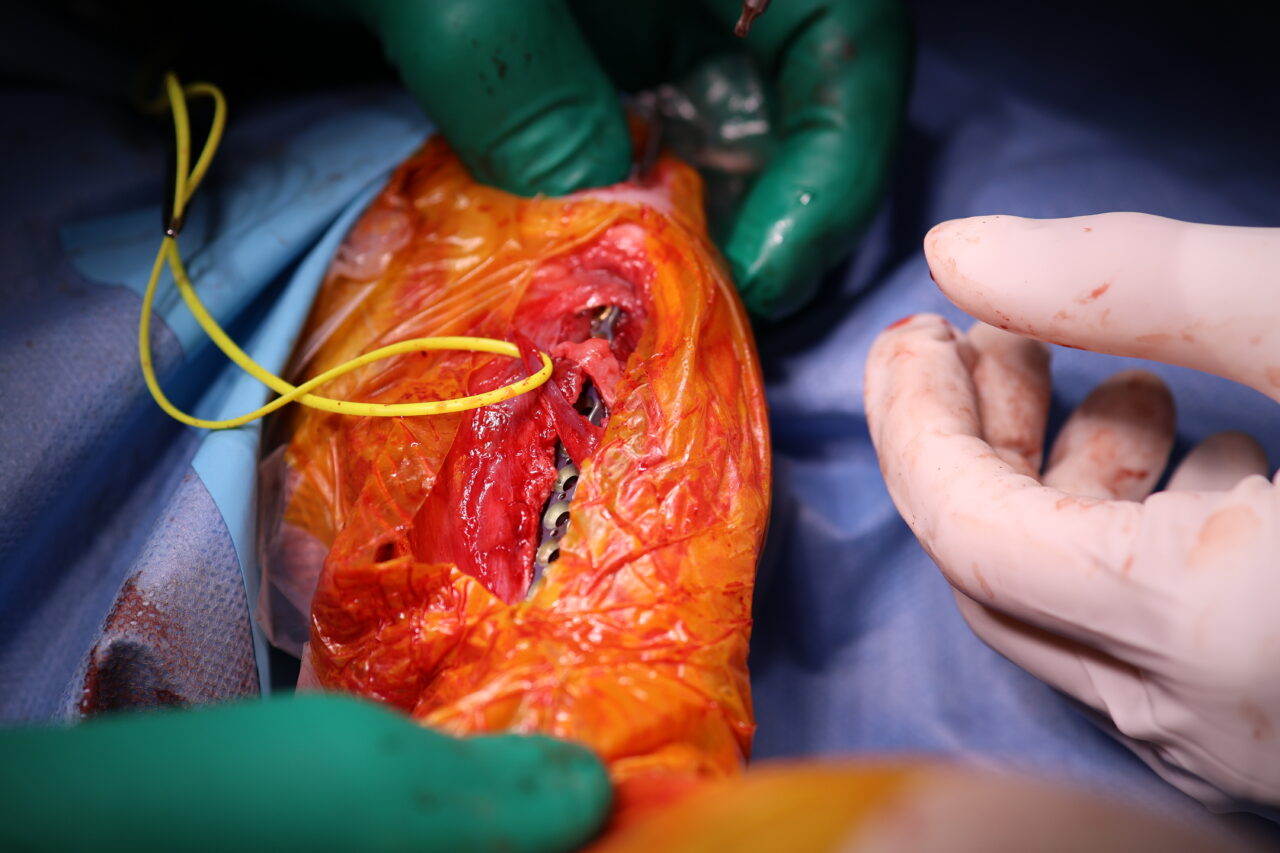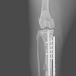 MIPO法は骨折周囲の軟部組織を温存できる一方で、正確なアライメント管理と固定設計が求められる手技です。術後X線ではアライメントは良好で、固定バランスも安定しています。今後は仮骨形成と骨癒合の経過を慎重にフォローしていきます。