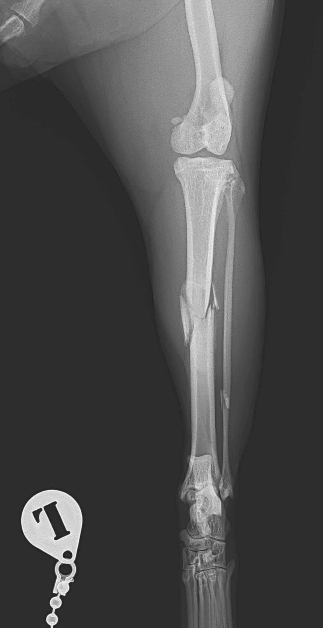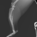 大型の猫に発生した脛骨(すねの骨)骨幹中央部の粉砕骨折 に対してIMピン併用でMIPO法(Minimally Invasive Plate Osteosynthesis) による整復固定術を行いました。