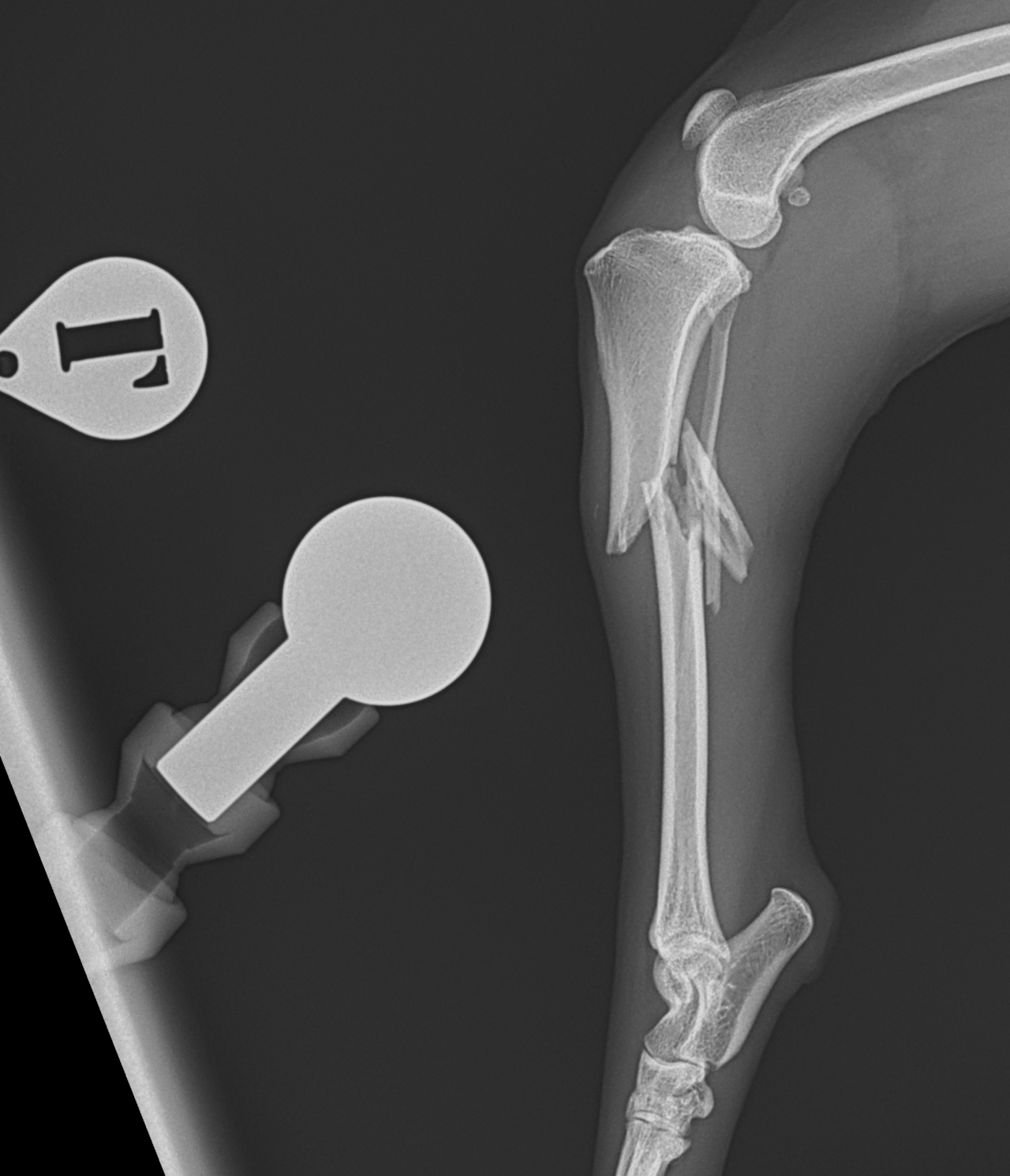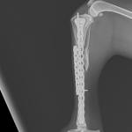 13歳のトイ・プードルがソファーからジャンプした際に後肢を傷めて救急病院を受診されました。エックス線検査で脛骨近位部の粉砕骨折(comminuted tibial fracture)が確定され、骨固定術の依頼がありました。小型犬では、ソファーやベッドなどの高さからのジャンプでも骨折が起こることがあります。特に高齢になると、骨密度の低下、骨皮質の菲薄化などにより、比較的弱い外力でも骨折が起きやすくなるため注意が必要です。今回の患者さんではOrthogonal ロッキングプレート固定+髄内釘(Plate–Rod construct)により骨折部を安定化しました。粉砕骨折では骨片を無理に整復せず、生物学的固定(biologic fixation)により自然な骨癒合を促す方法が現在の主流です。高齢犬でも適切な固定を行えば、良好な骨癒合と歩行回復が期待できます。