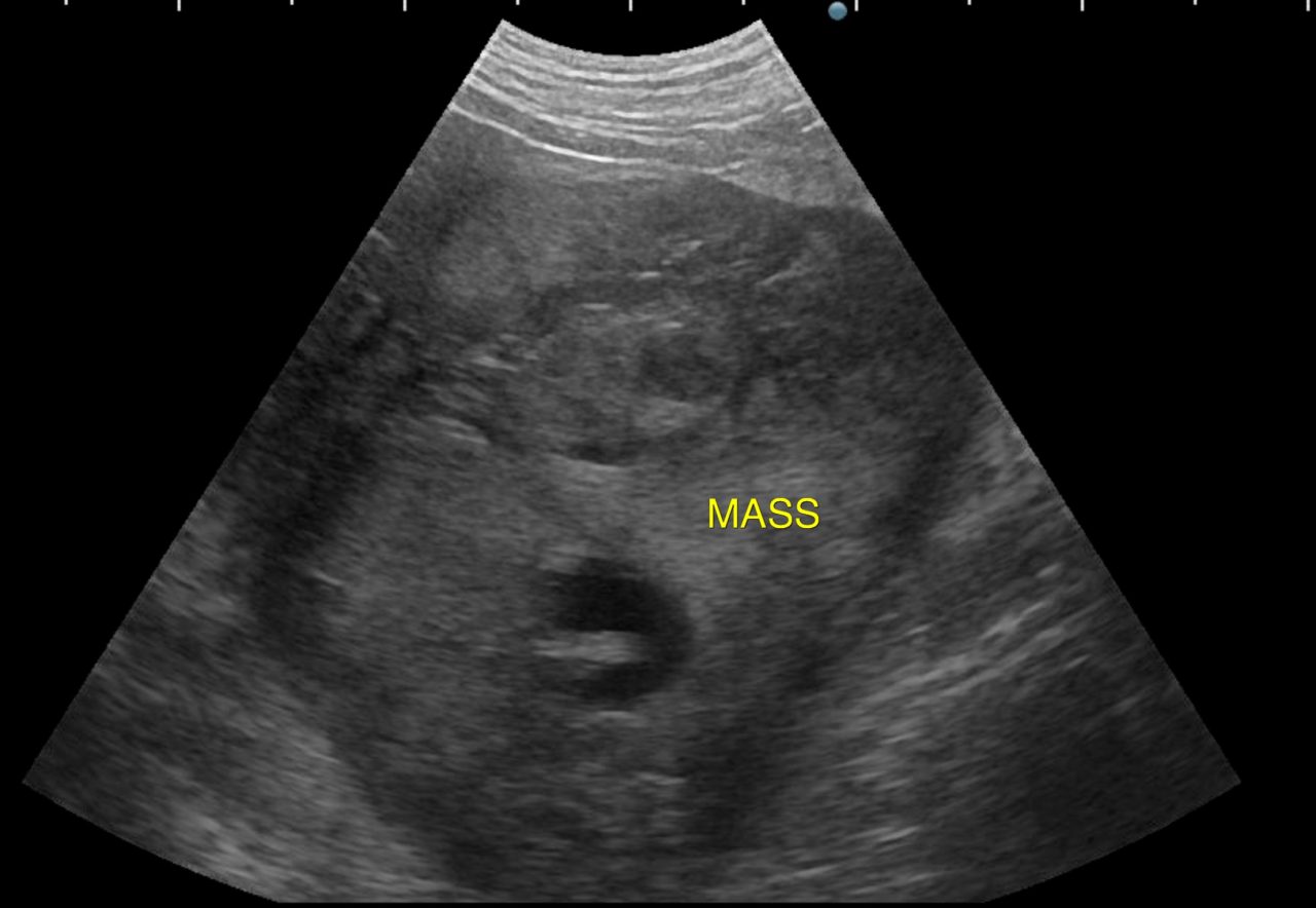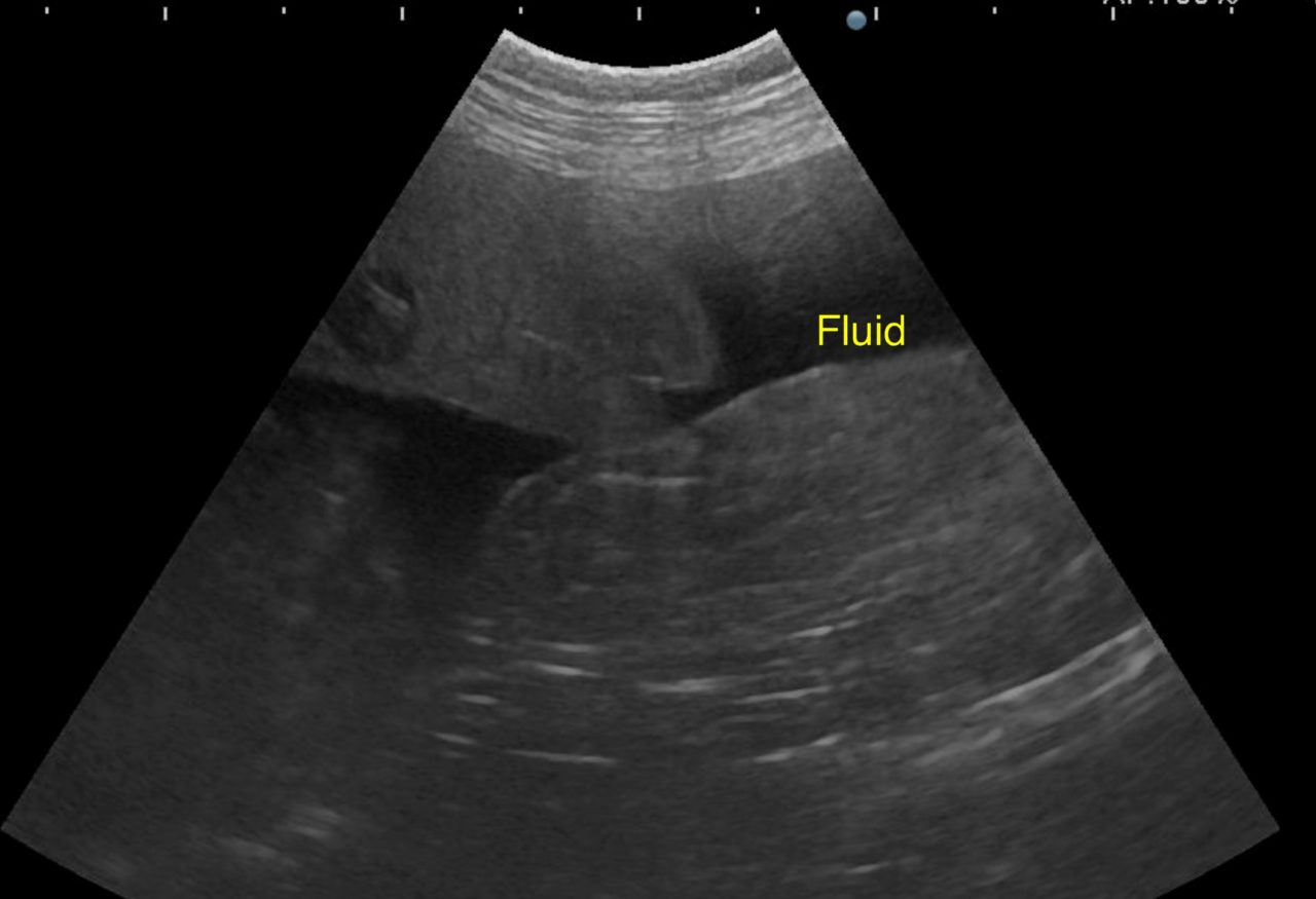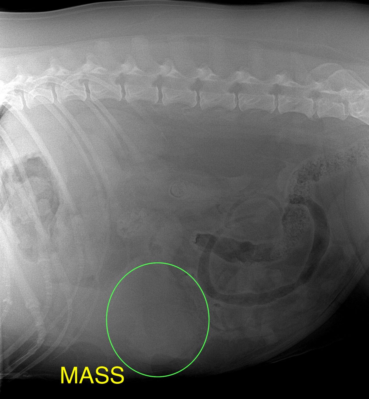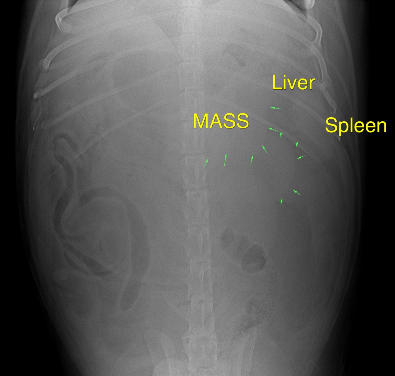 歯茎白い。すぐさま腹部の超音波検査をして”腹腔内液体貯留と腹腔内腫瘤を確認”
