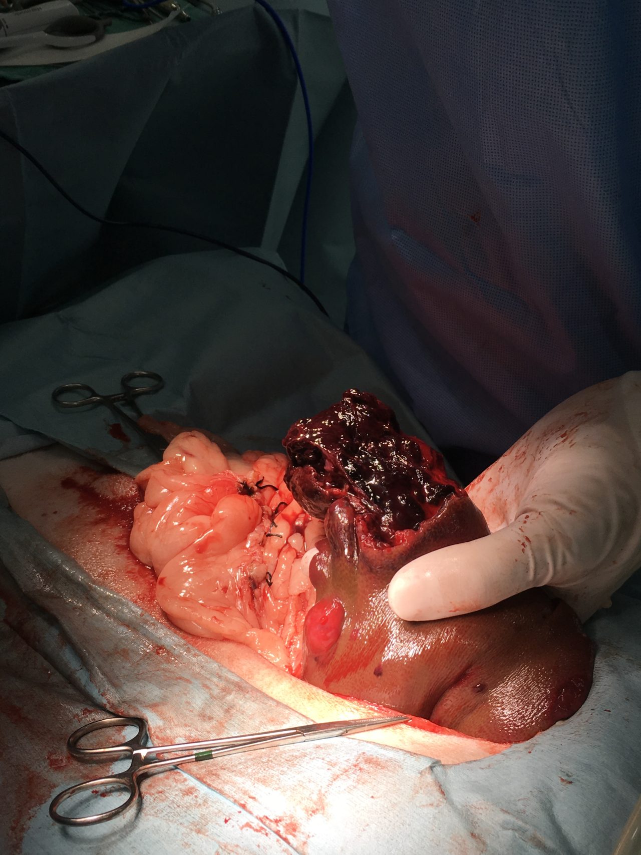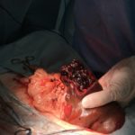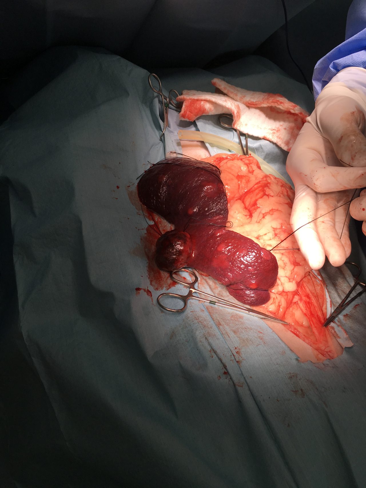 開腹すると脾臓と肝臓に腫瘤病変があり破裂、出血していました。