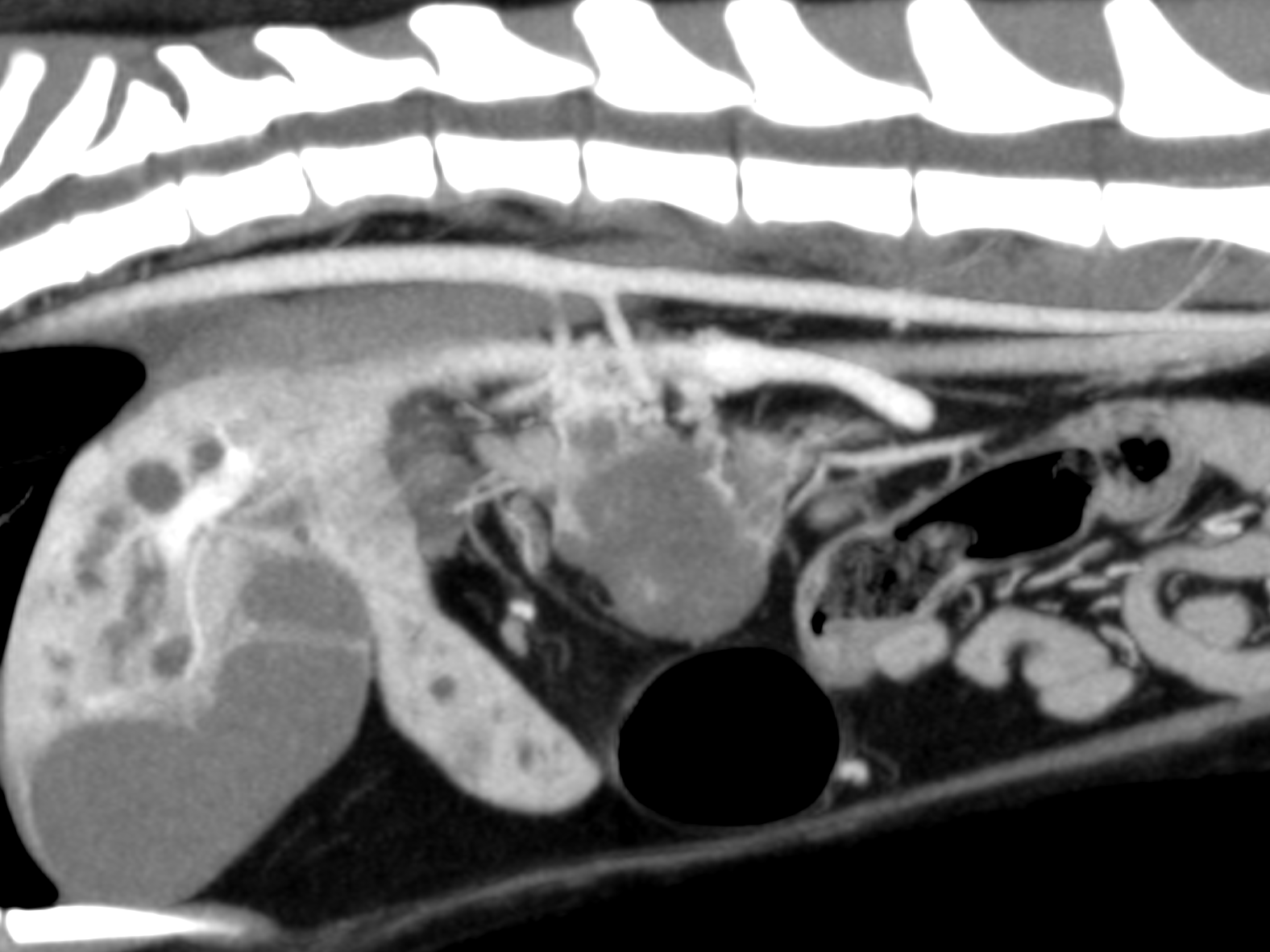 腹部エコー検査で総胆管開口部に腫瘤が形成されており、これにより胆汁が腸へ流れない状態となっていました。