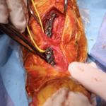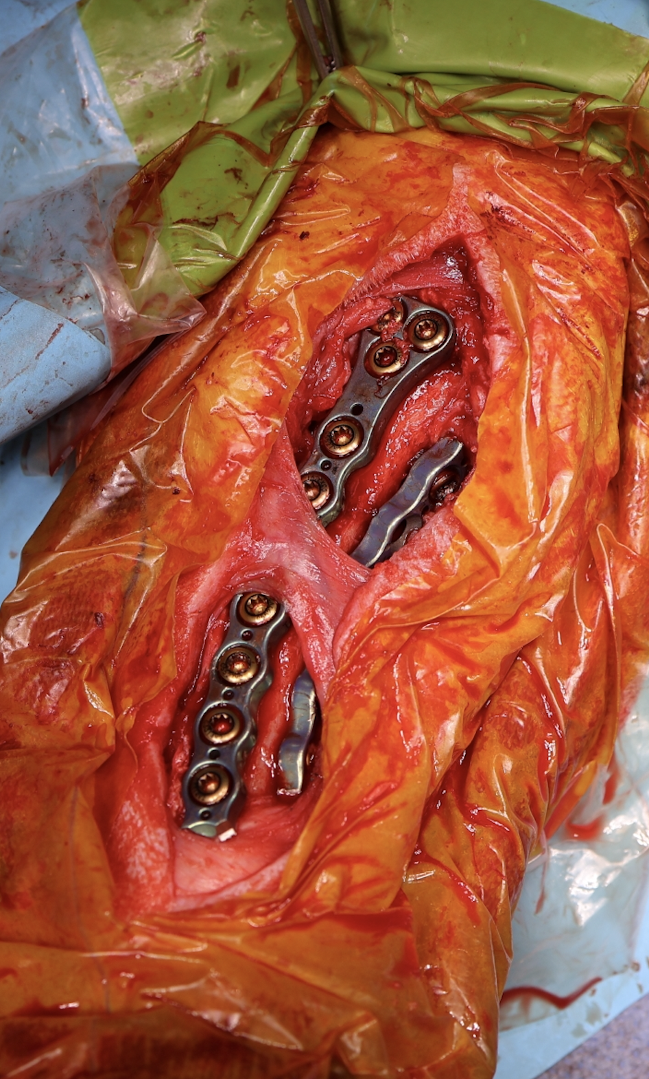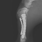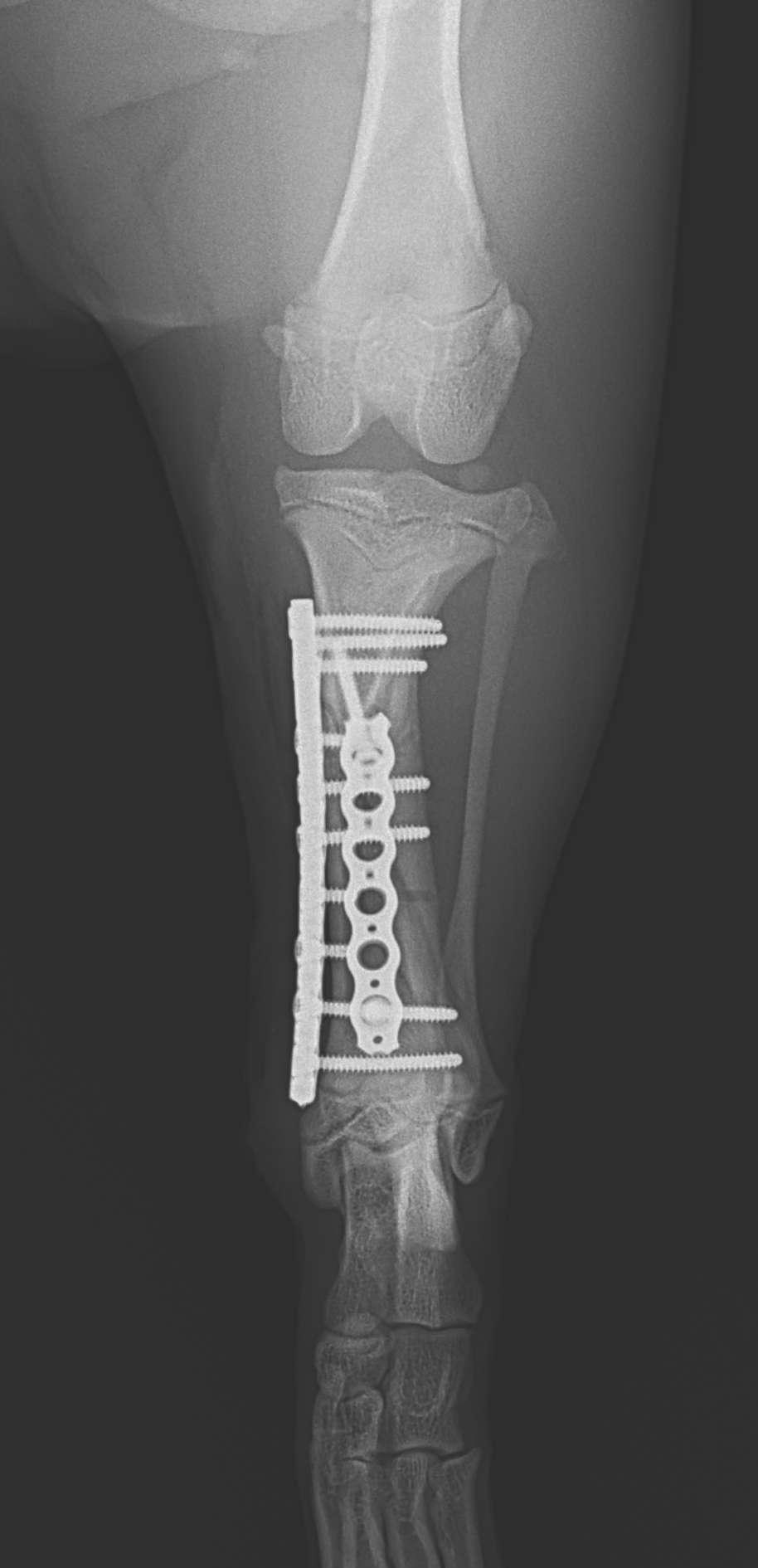 パピーがアクシデントで脛骨を骨折したとのこと。かかりつけ医から固定術の依頼がありました。長くらせん状に骨折ラインが確認されました。Titanium Locking Plateを使いオルソゴナル・ダブルプレート法で固定術を行いました。また、このワンコの脛骨の形状は特殊であり、近位の骨幅は広く確保できるのですが、骨幹部は湾曲が強くプレーティングには工夫が必要です。しばらく安静が必要ですがまたドッグランで走れるようになれます。