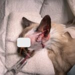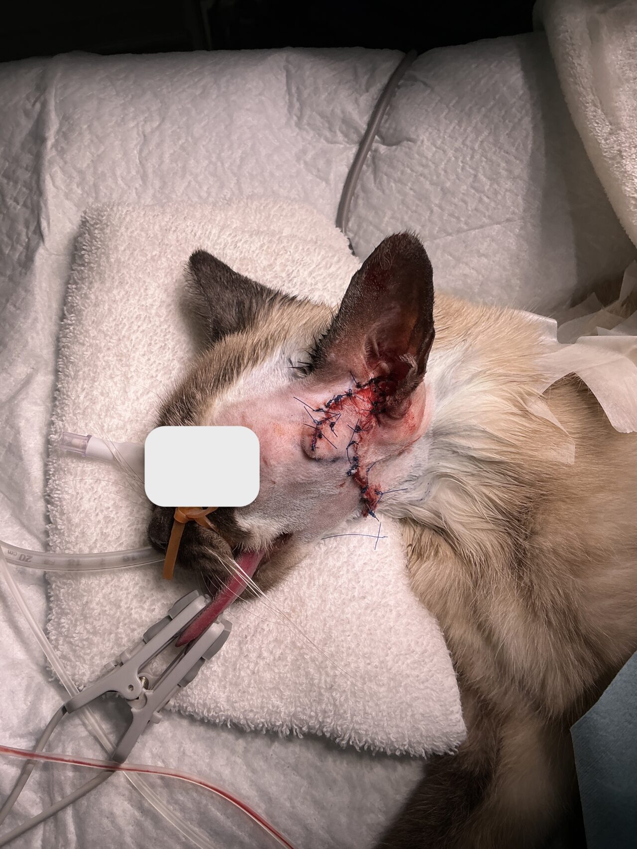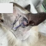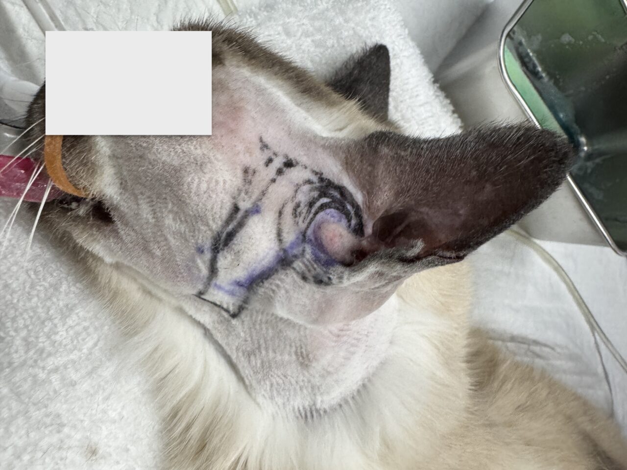 肥満細胞種のマージン確保のためには耳介全層切除(皮膚+軟骨)が必要であり、単純縫縮では欠損が大きく、変形・血行不良のリスクが高いので、90度回転皮弁(transposition flap)を選択した。理由としては