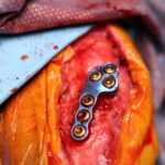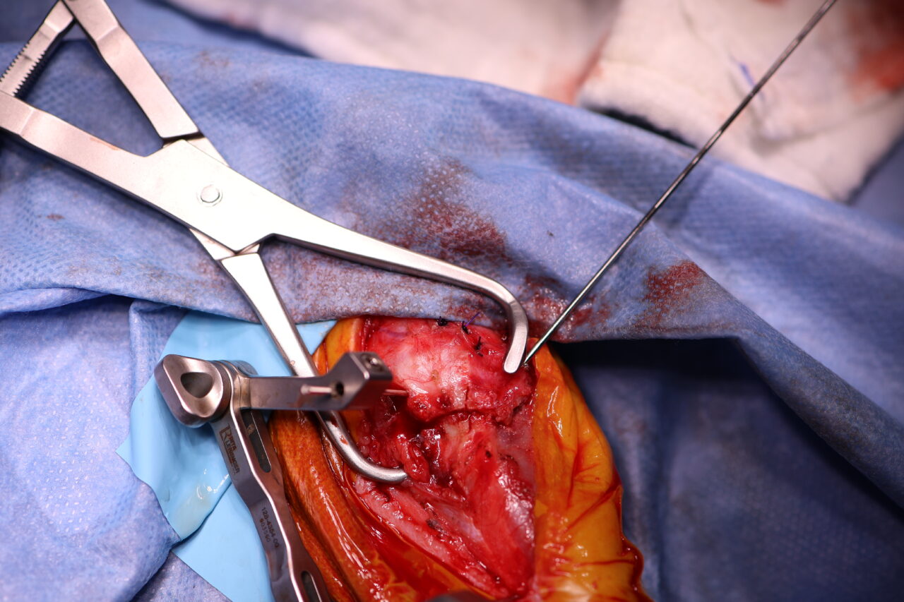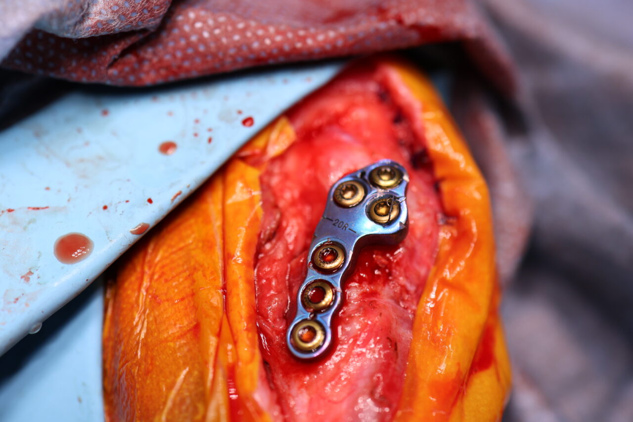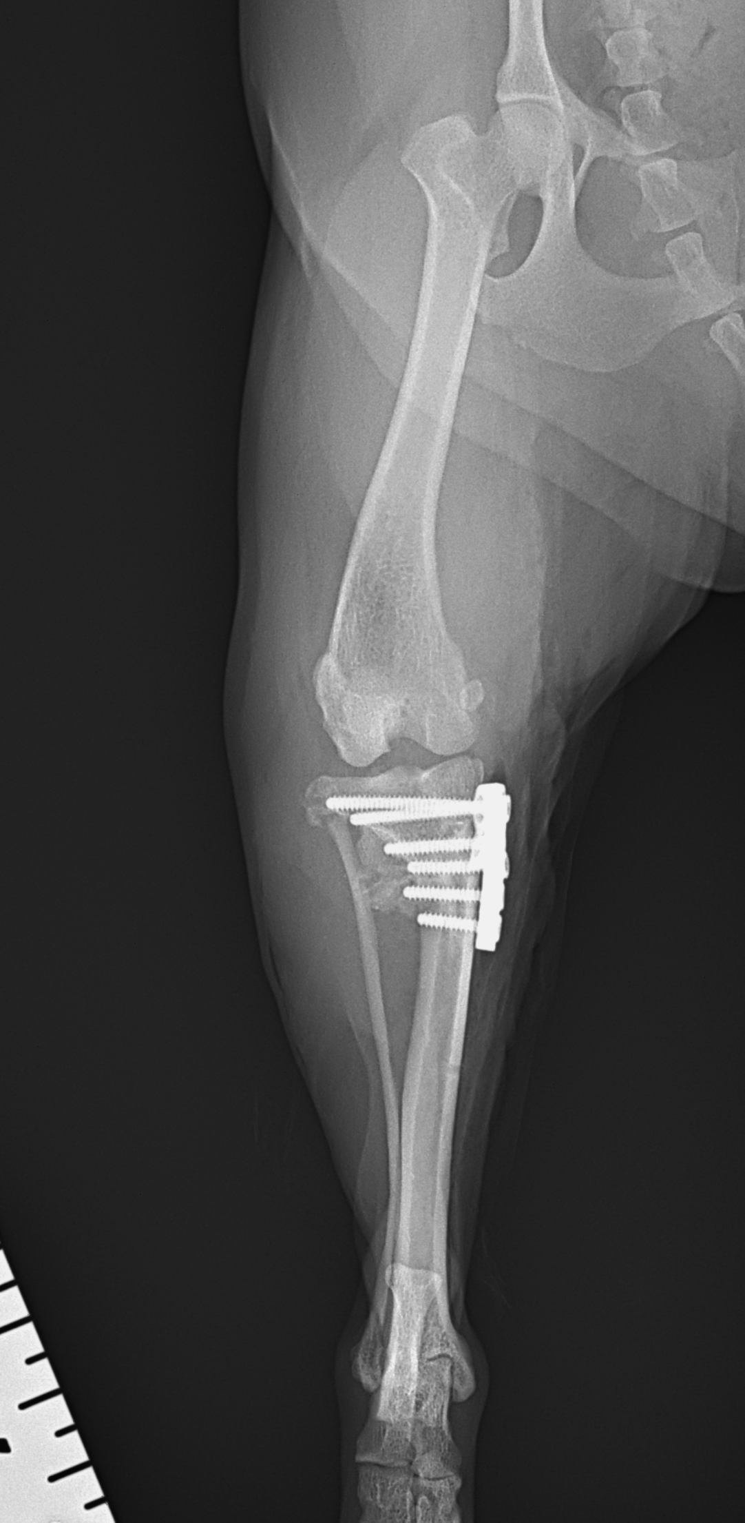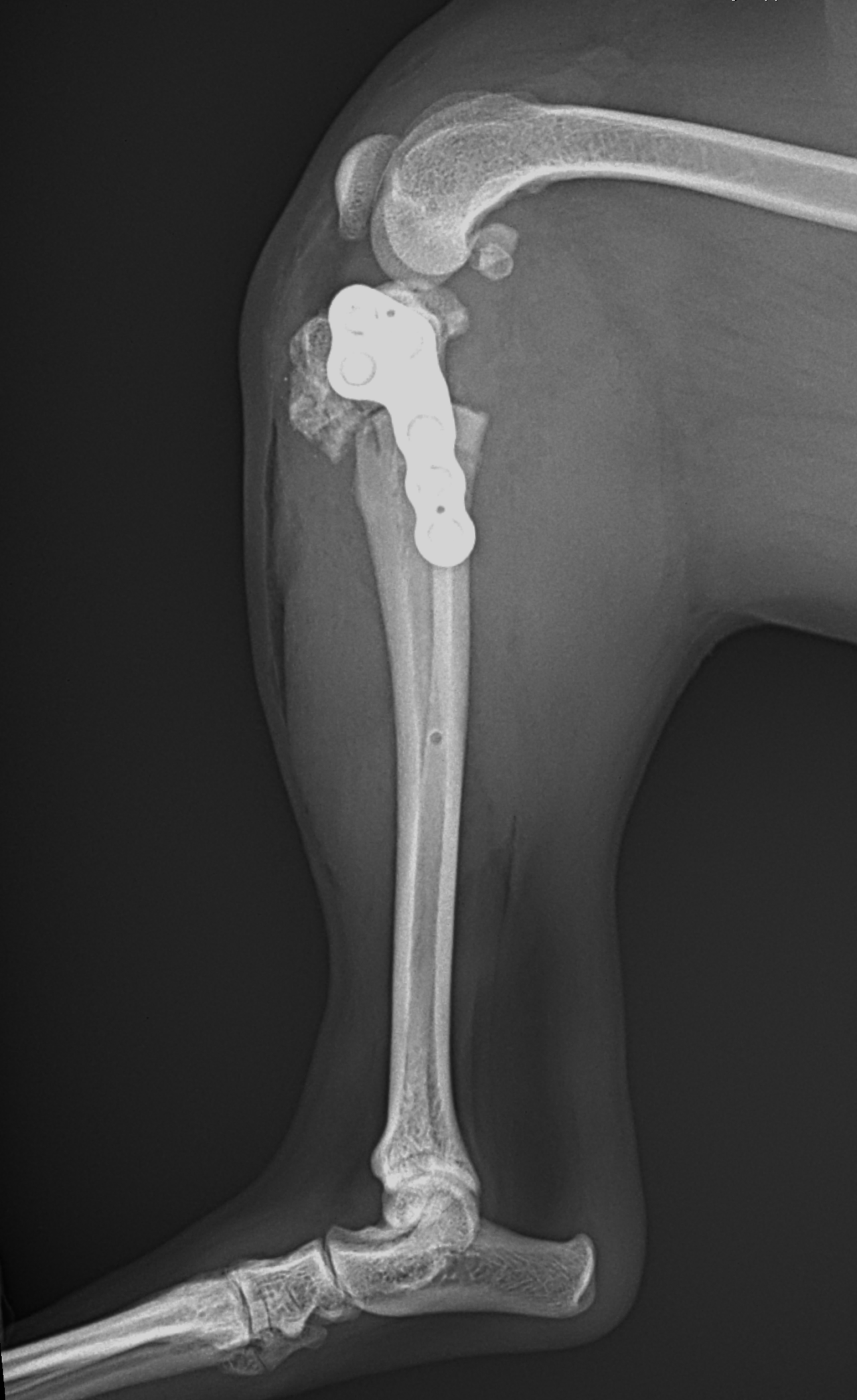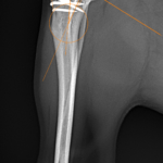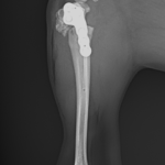 Toy Poodle×マルチーズのMix犬が前十字靭帯断裂により跛行が持続しているとのことでかかりつけ医より外科手術のために紹介来院されました。過去に膝蓋骨内方脱臼の手術を受けています。脛骨粗面移行術で使用されていたピンを除去したのち、CBLOで対応いたしました。しばらく安静が必要です。