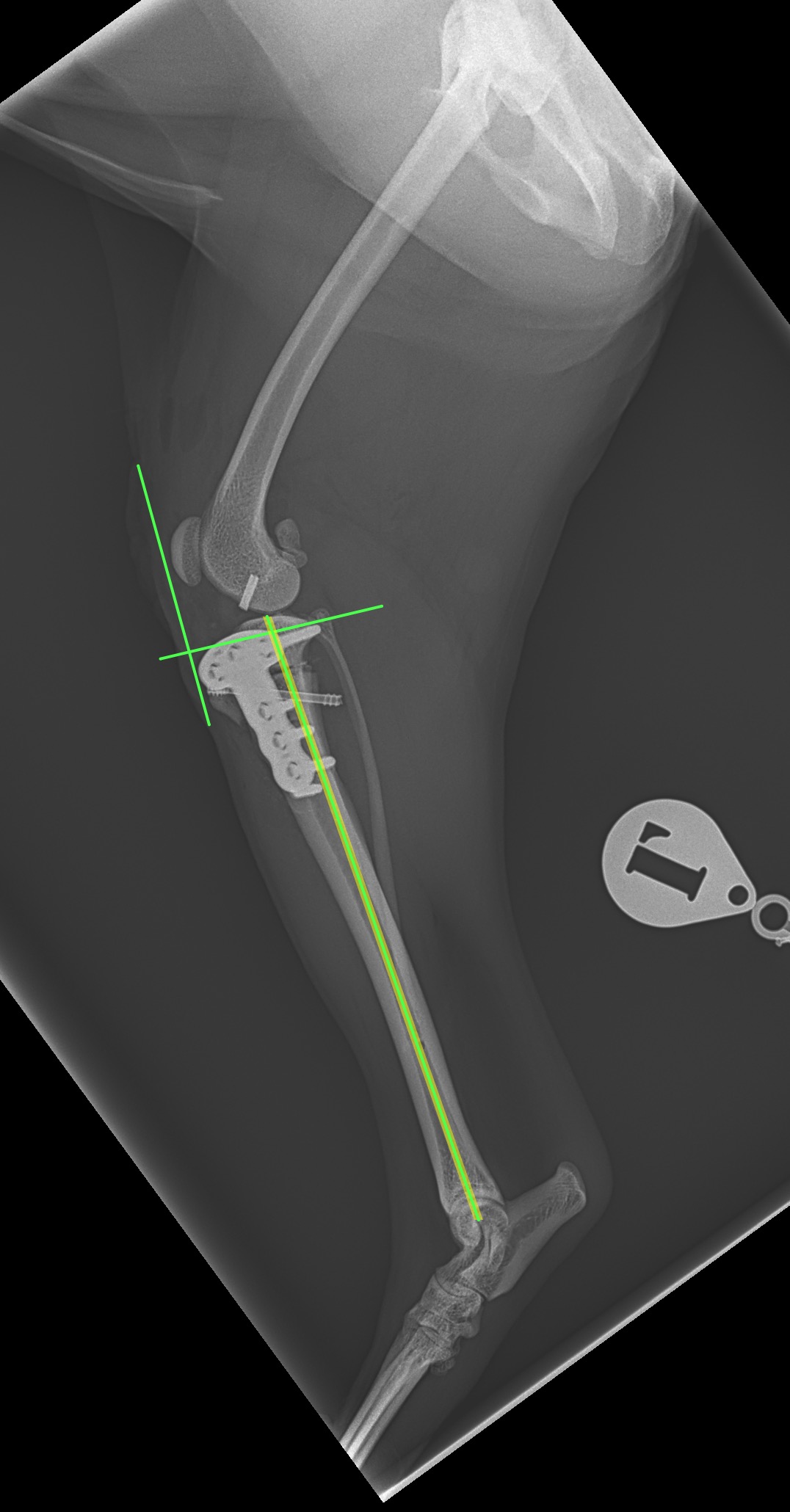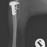 前十字靭帯(完全)断裂に対してCBLO+LSSで対応しました。麻酔下における脛骨ピボット圧迫試験がPositiveであったため、脛骨の内旋矯正のためアンチローテーションスーチャーを追加しています。術中に脛骨の内旋が消失したことが確認されました。前十字靭帯断裂の約30%に術後に脛骨の内旋が残存すると報告されており、術中に不安定性が認められる場合はTPLOやCBLOのみでは脛骨前方スラストは抑制されても、膝の内旋は矯正されないので注意が必要です。