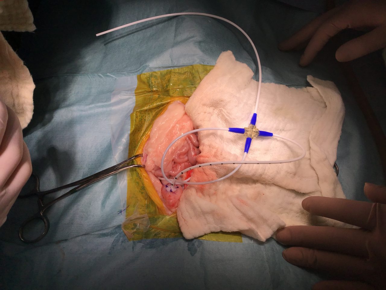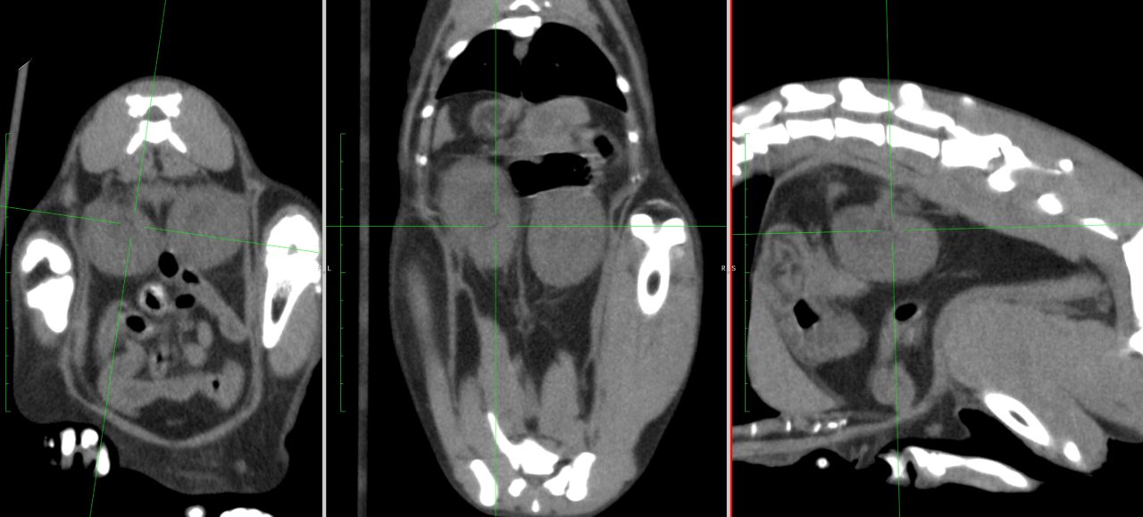 猫さんが急に具合が悪くなって、かかりつけ医を受診したところ血液検査で腎数値が著しく上昇し、高カリウム血症になっているとのこと。すぐに原因を調べて必要な処置をして欲しいとのことで来院されました。無麻酔CTでは尿管結石は確認されませんでした。すぐに拡張した腎盂に腎瘻カテーテルを設置し、尿の排泄路を確保しました。数日後アシドーシス、高カリウム血症は改善されました。尿管炎に伴う尿管の運動機能障害、エックス線に映らない結石の閉塞(99%近くシュウ酸Caなのでまず考えにくい)などが考えられましたが、腎瘻カテーテルを一時的に閉鎖すると腎数値が上昇傾向にあるため、両側の尿管の機能障害と判断しSUBシステム(人工尿管)によるサルベージを行いました。手術の翌日には腎数値は正常に回復しました。CTによる猫の尿管結石の検出感度は非常に高く、術式の決定や治療方針について細かい評価が可能です。今後は血液検査で腎数値のモニタリングを行いながら、定期的にインプラントの洗浄やメンテナンスが必要になります。