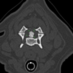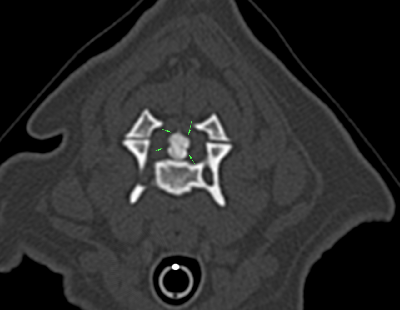 頸の痛みとふらつきを主訴にペキニーズさんが受診されました。CT/MRIで脊髄の状態を確認するとC3~C4に重度の脊髄圧迫病変が確認されました。Ventaral Slotで除圧術を行いました。数日は呼吸状態に留意しながら、回復を待ってリハビリテーションを検討します。